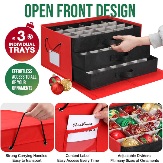 Ayieyill Premium Large Christmas Ornament Storage Box, Christmas Ornament Organizer, with Side Open, 3 Removable Trays - Keeps 72 Holiday Ornaments