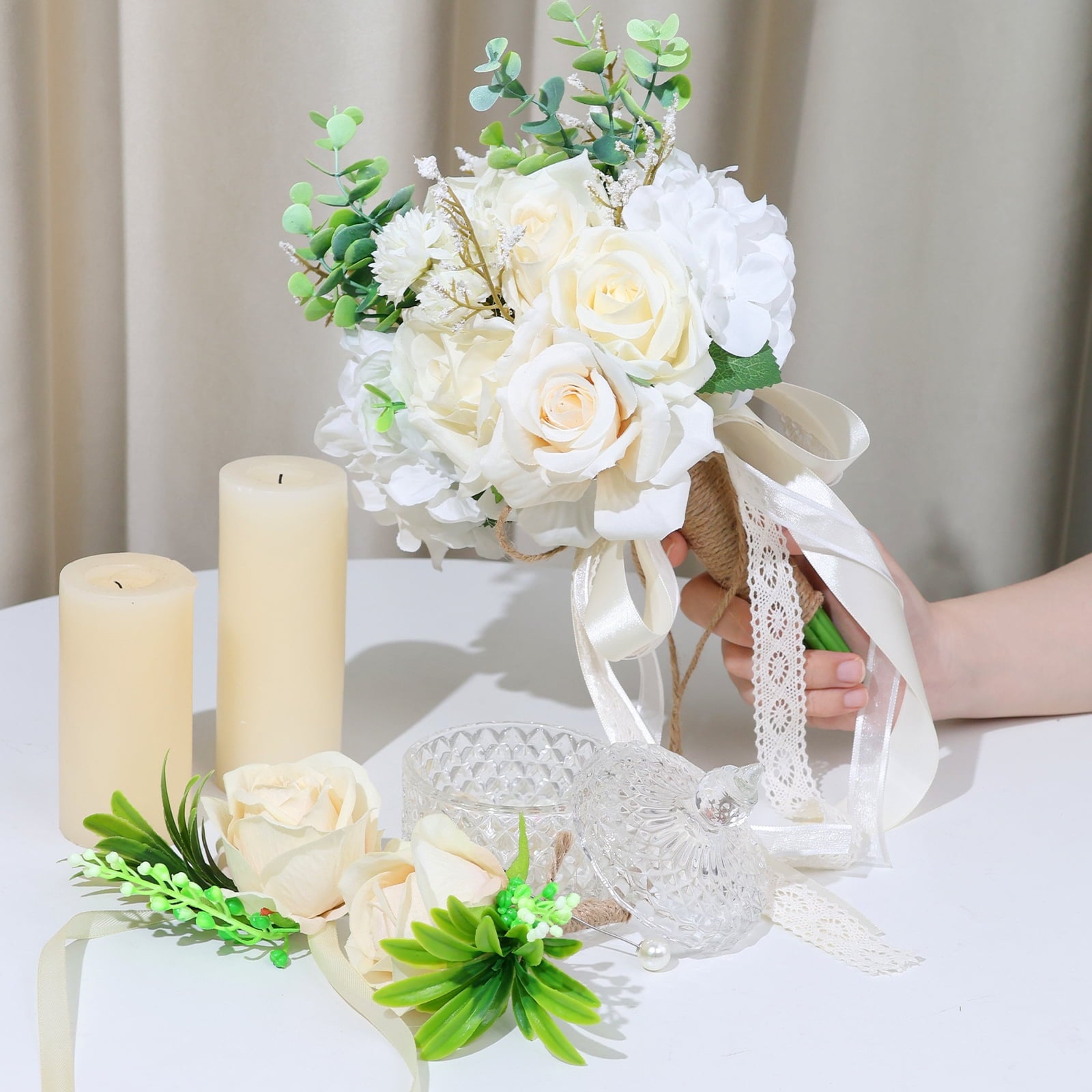 - 【Detailed Craftsmanship】The bouquet is 12 inches tall and features artificial roses, artificial greenery and satin ribbons accents. Wedding flower decorations create a sophisticated and graceful look for your wedding ceremony and event, ideal for your wedding decorations.