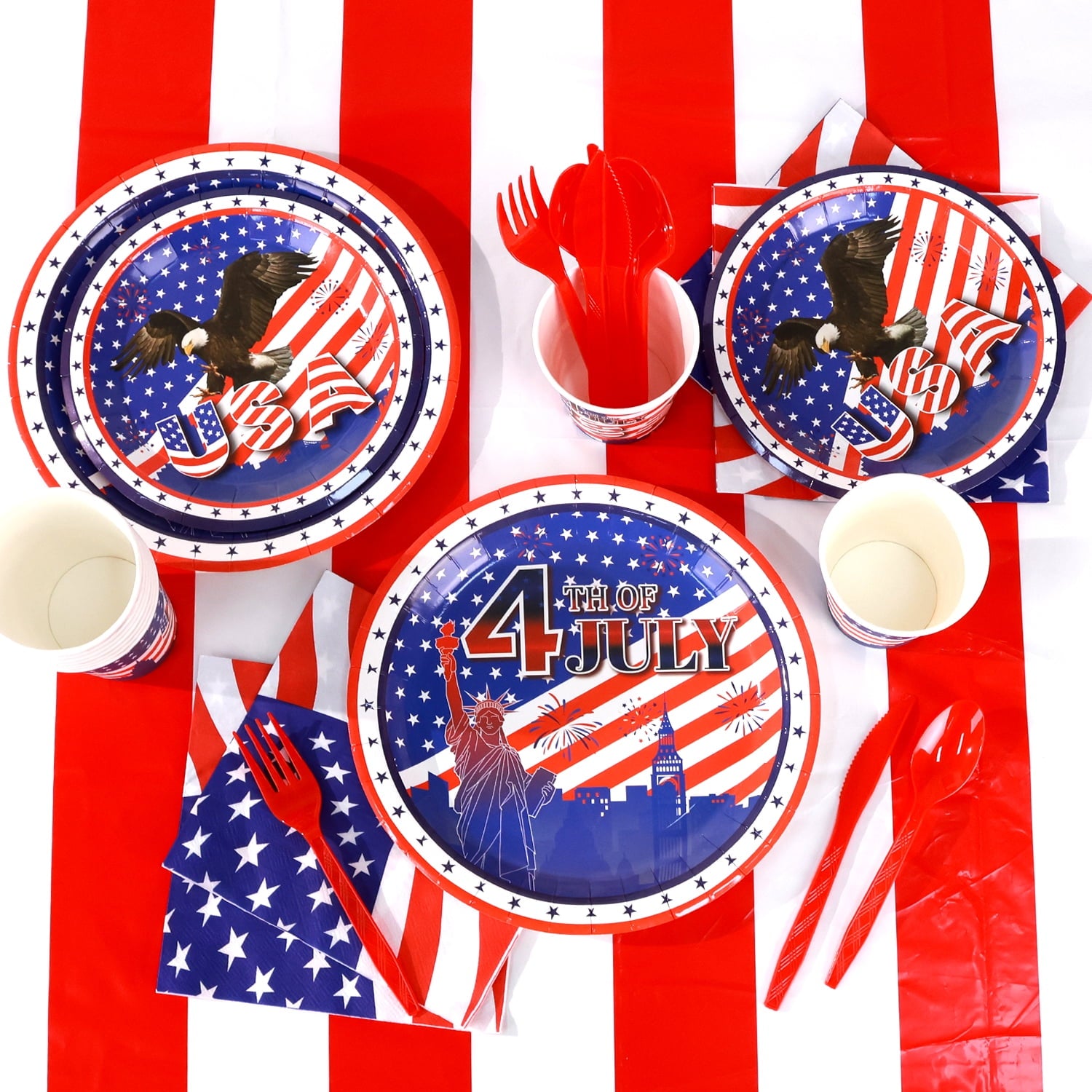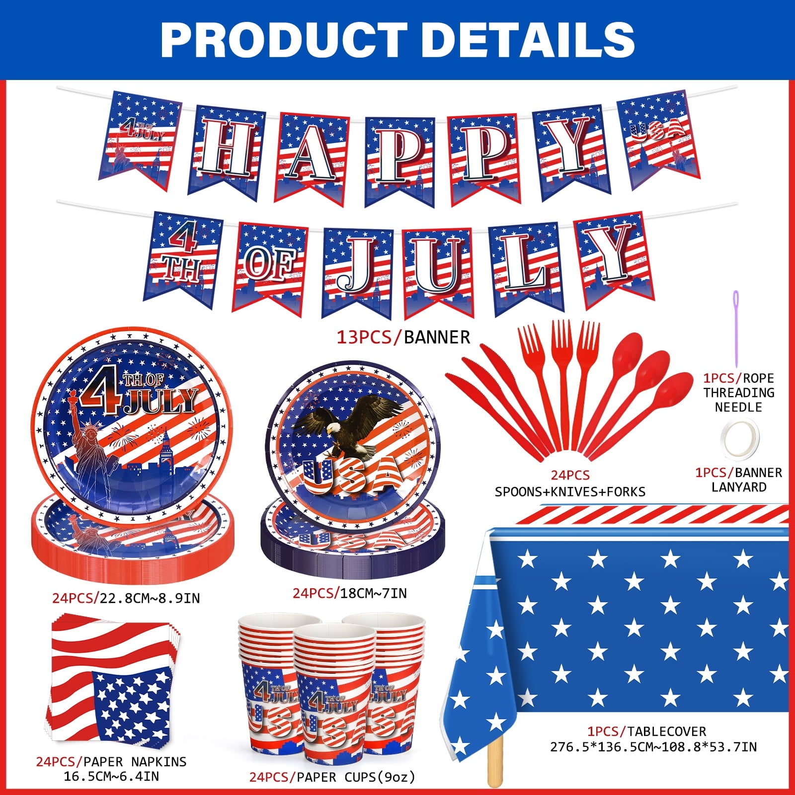 - 【Super Value Pack】Ayieyill 170pcs Patriotic Party Supplies set includes 24 pcs 9" american flag paper plates, 24 pcs 7" american flag plates, 24 pcs 9 oz paper cups, 24 pcs 6.4" x 6.4" napkins, 24 pcs plastic forks, 24 pcs plastic knives, 24 pcs plastic spoons,1 pcs patriotic banner and 1 pcs 54*109" tablecloths.