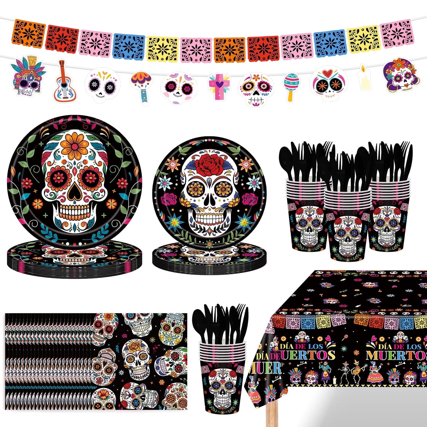 Ayieyill 170Pcs Day of the Dead Party Decorations Kit, Dia de los Party Supplies Set for 24 Guests, Includes Plates and Cups and Napkins Straws Sets