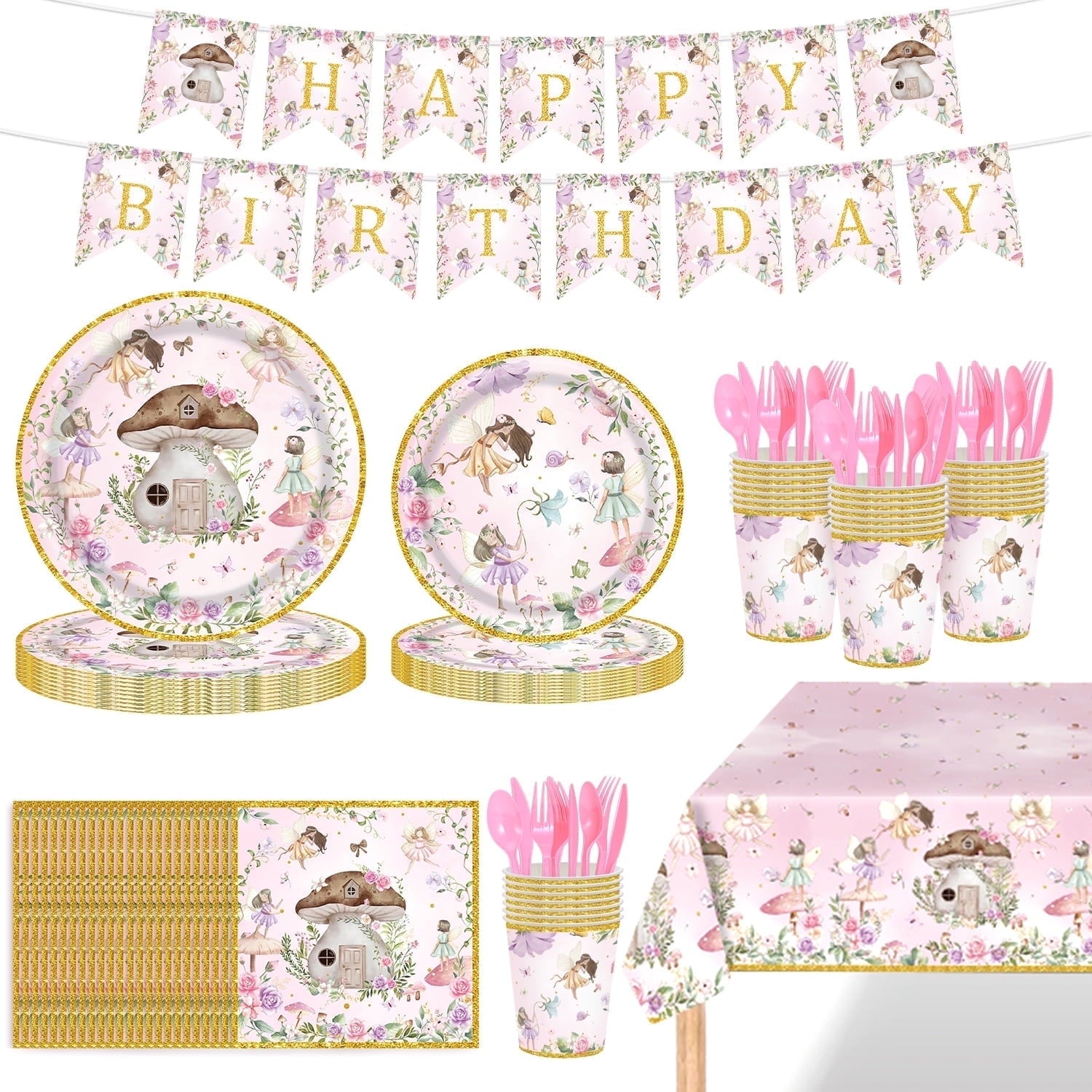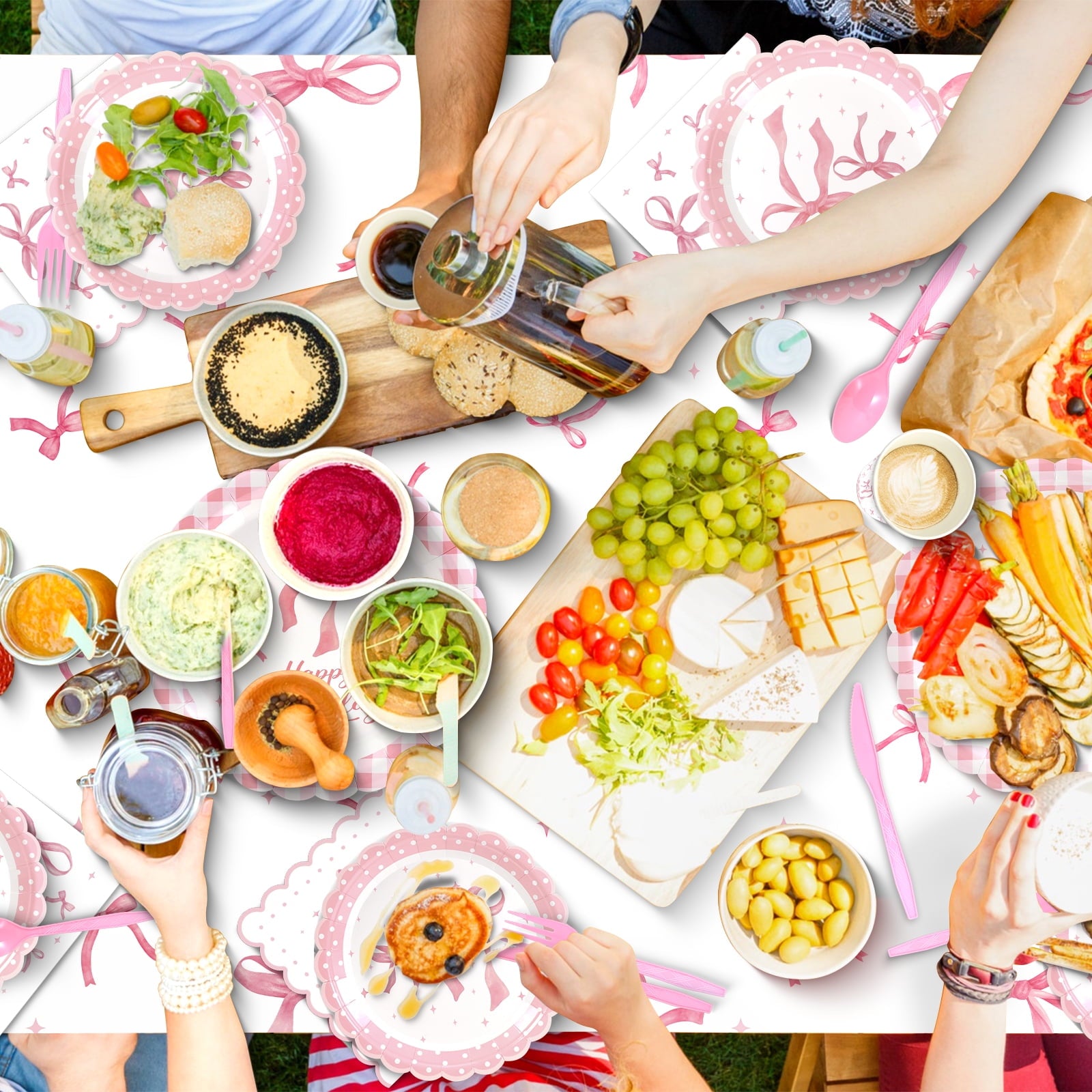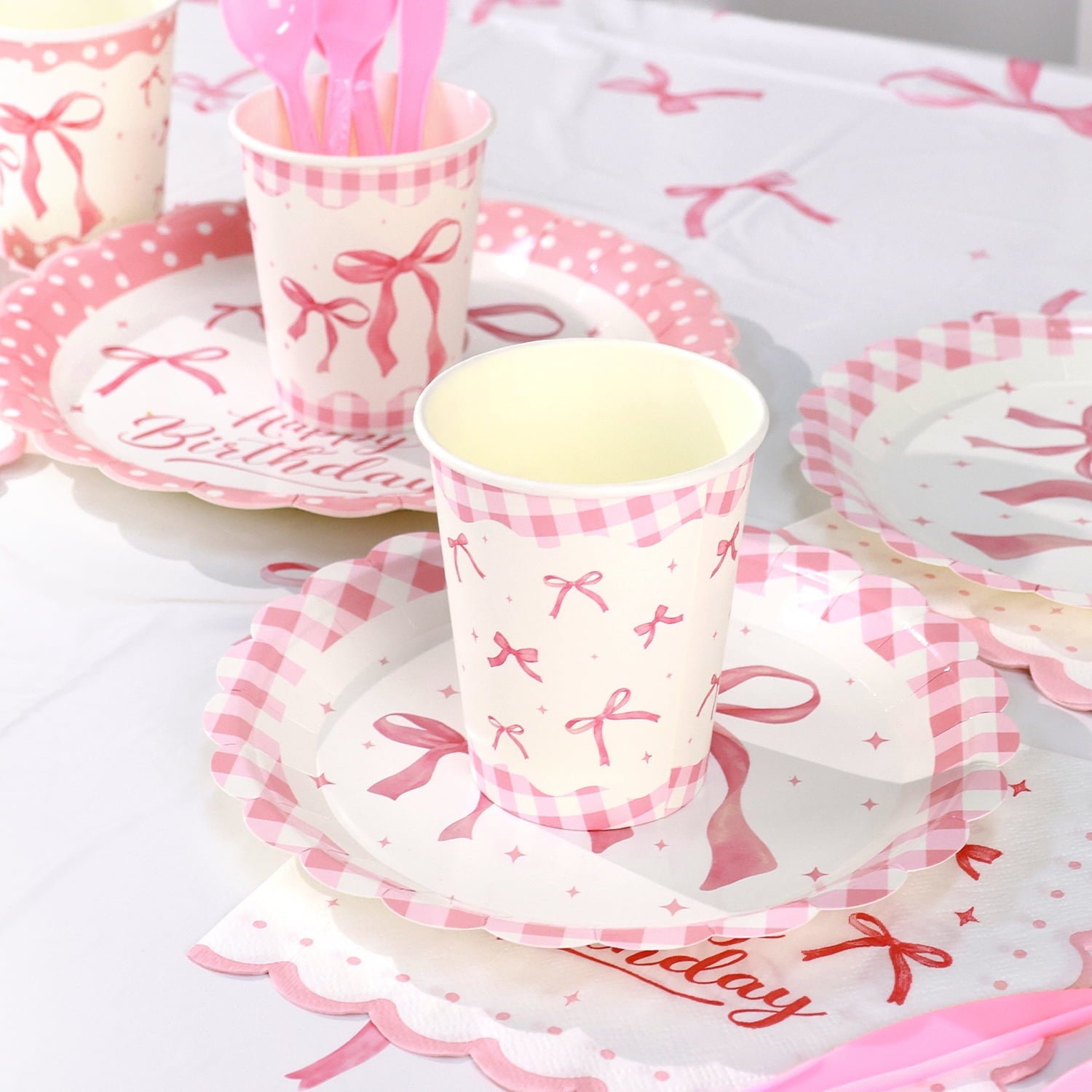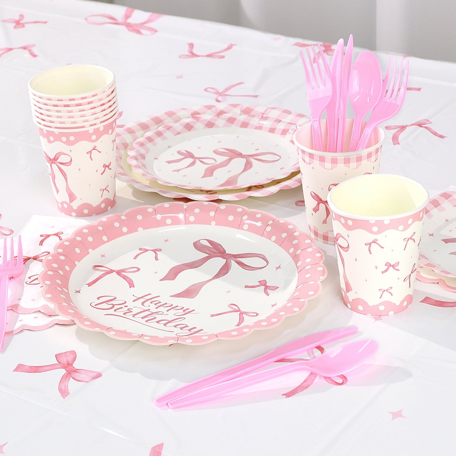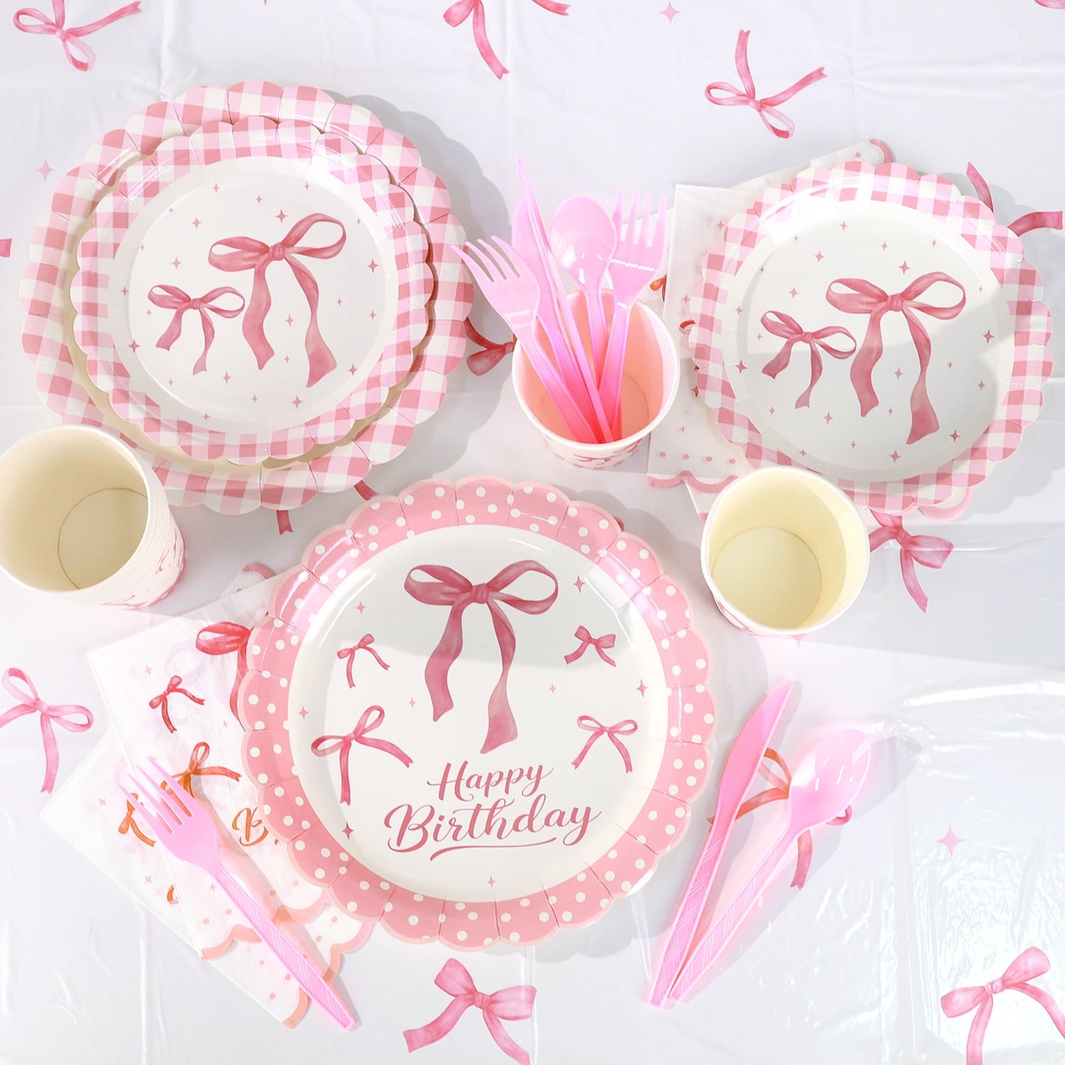 - Ayieyill Birthday Party Supplies Kit: Our complete bow set includes 24 dinner paper plates (9 inches), 24 dessert paper plates (7 inches), 24 napkins, 24 paper cups (9 oz), 24 knives, 24 forks, 24 spoons, 1 bow tablecloth (54 x 108 inches), and 1 bow banner, making party preparation effortless.