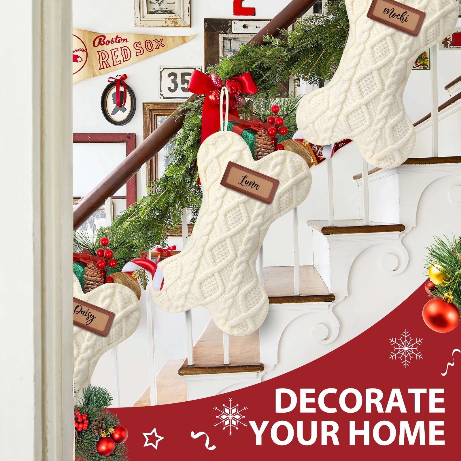 Unlike the common fabric on the market, These uniquedog Christmas stockings are made of soft, plush yarn material with classic knit pattern, thick and with good elastic function, and beautiful handmade style, elegant and stylish, beautiful and strong, durable and long lasting. Each Christmas stockings for dogs has a hanging loop, easy to hang.