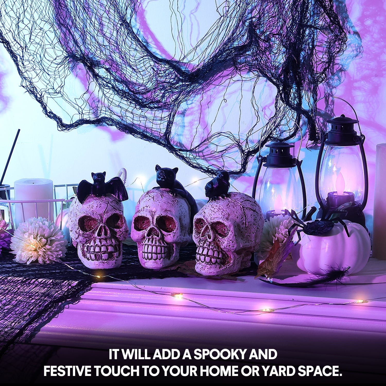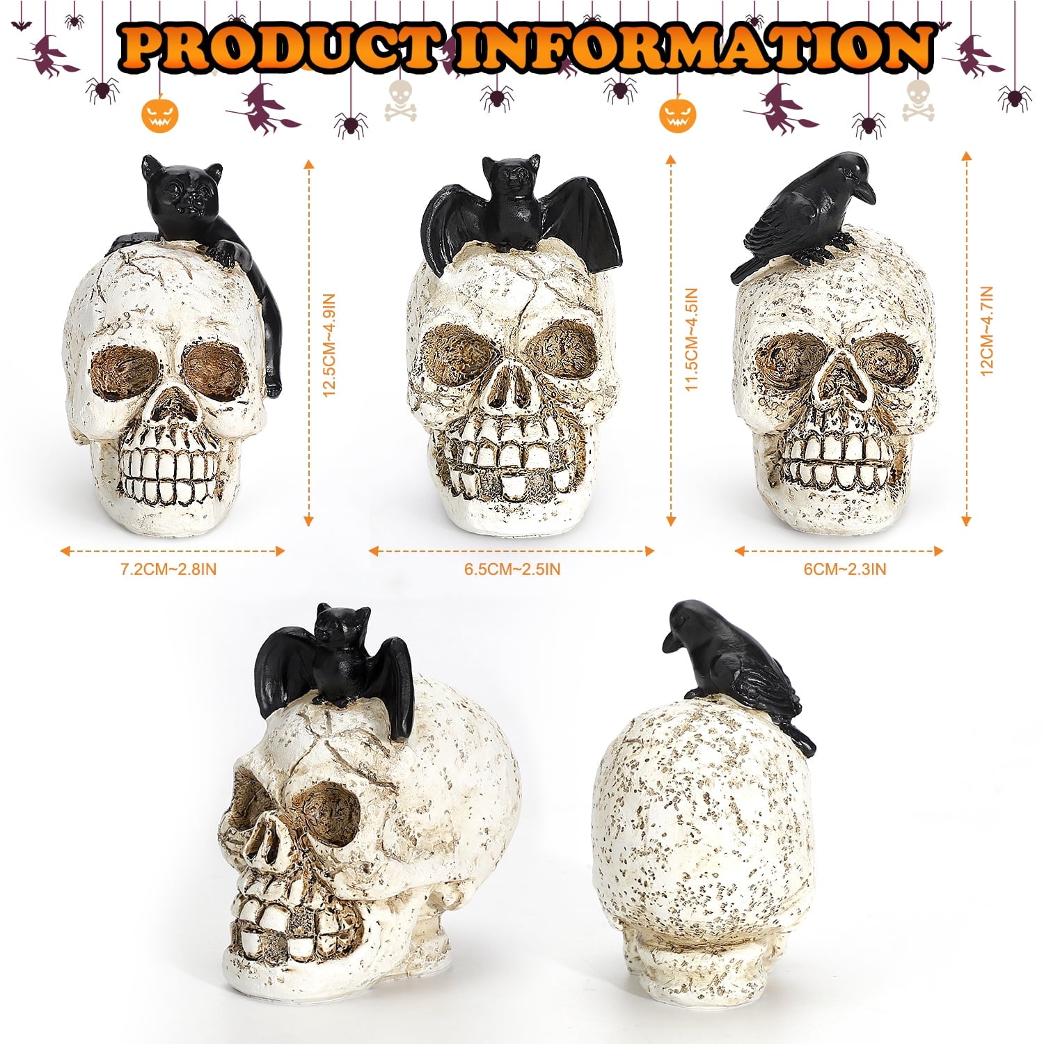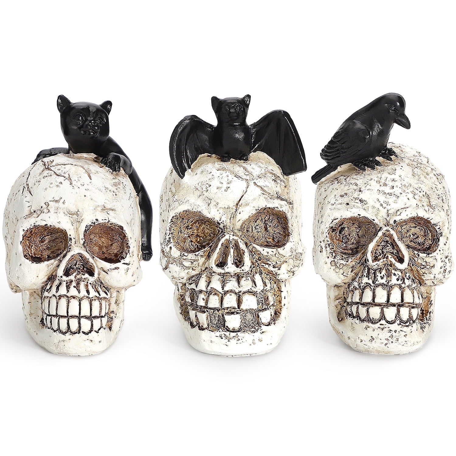 Ayieyill 3pcs Skull Halloween Decorations Indoor Skull Decor Halloween Figurines Cat Bat Raven Skulls Halloween Decor