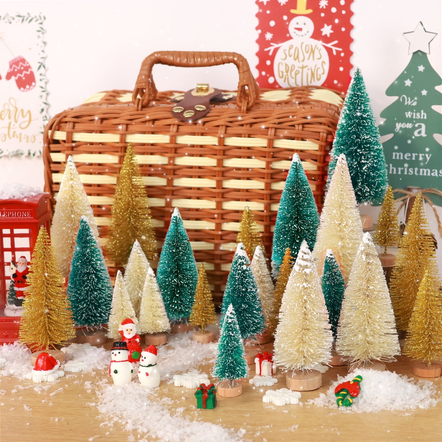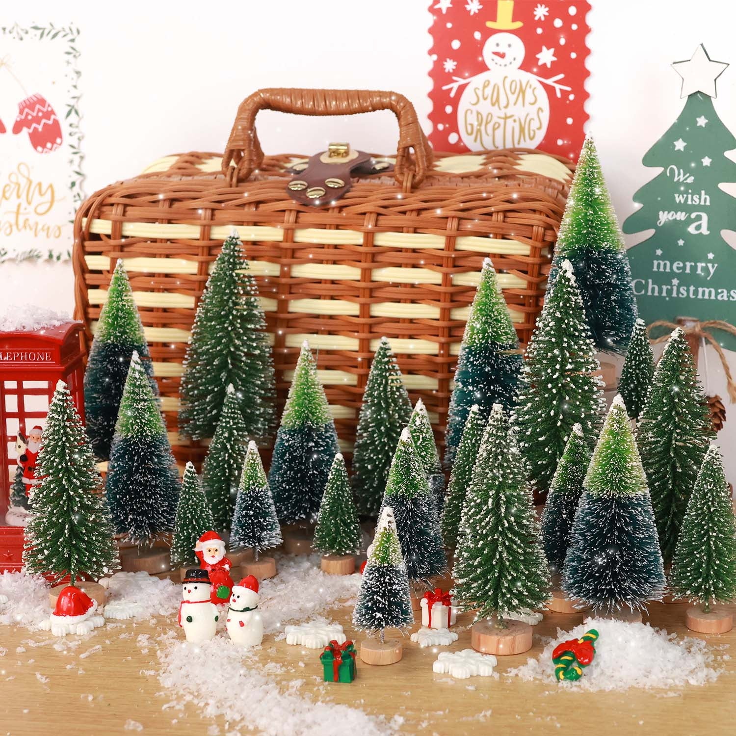 Products contain: Bottle Brush Christmas Trees, Christmas Village Sets Doll, 56 grams of snow powder