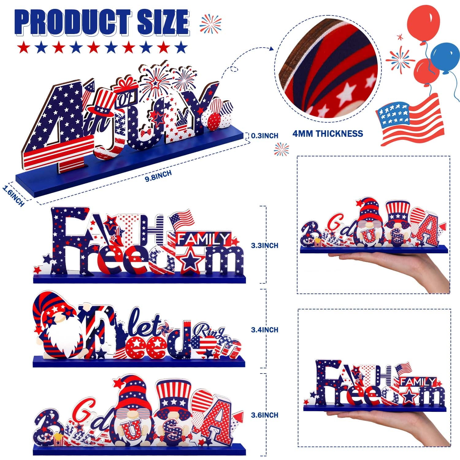 Size: the size of God Bless USA sign decor is 9.8x 3.6 inch, the size of Let Freedom Ring sign decor is 9.8 x 3.4 inch, the size of Faith Family Freedom sign decor is 9.8 x 3.3 inch, the size of 4th of July sign decor is 9.8 x 3.6 inch, the size of wooden base is 9.8 x 1.6 x 0.3 inch; Please make sure the size before you buying and allow error for manual measurement