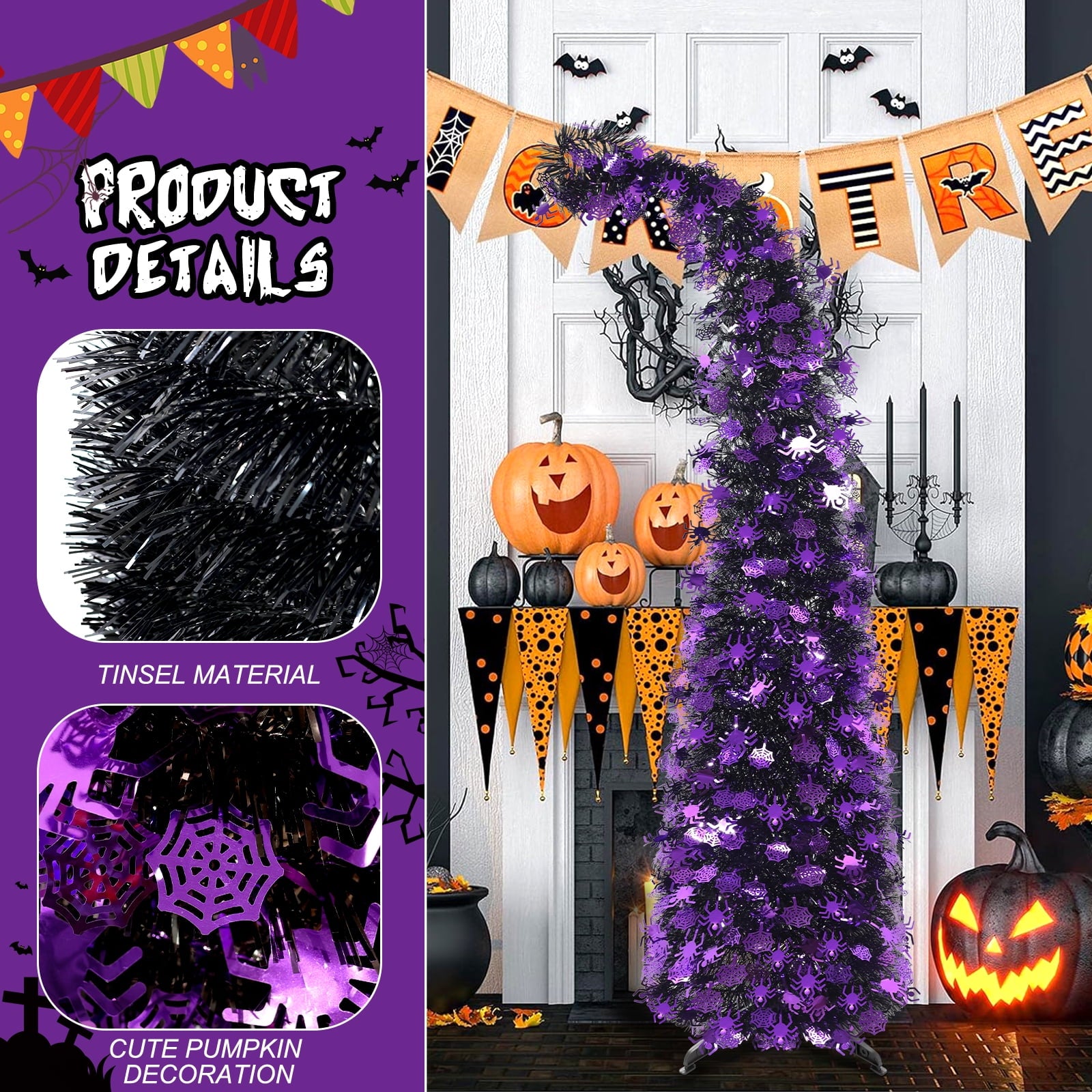 [ Tinsel Halloween Tree with Jack-O-Lanterns Pumpkins ] Halloween Black Tinsel Tree for Home and business Halloween decorations. The tree is wrapped by black thin-cut foil spiral iron wire.