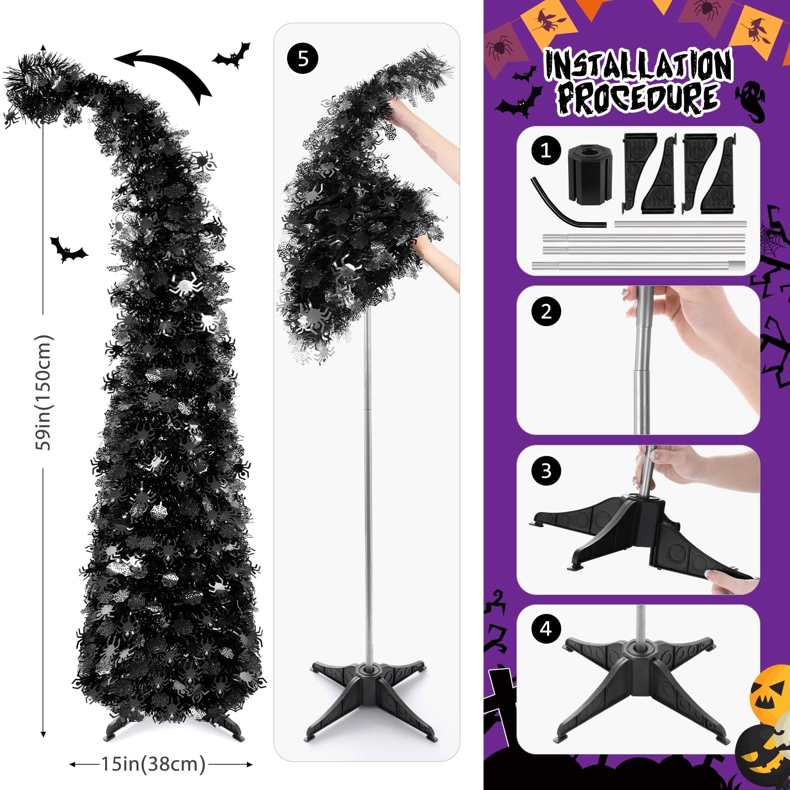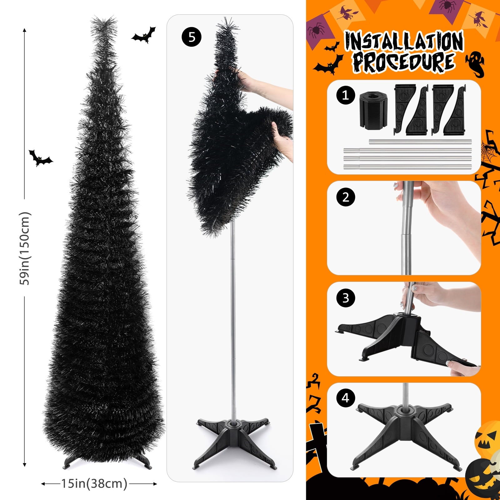 Ayieyill 5ft black halloween tree is made of 115 premium PVC branch tips, flame-retardant. Black appearance breaks the traditional trees' style of colors, with different decorations, artificial halloween tree could match various party themes, such as Halloween. Allocating 20 minutes to properly fluff the branch tips will ensure a full and naturally-shaped Xmas tree. Hang ornaments, ribbons. Our gift of 50 UL-recognized warm white lightsand any other decorations of your choice onto the branches. Halloween tree with lights is 25" in diameter and has a mini design, making it perfect for desks, counters, tables, smaller spaces and apartments. Besides, Thickened base can provide greater support to improve the overall stability of Halloween tree, ensuring you can enjoy it for many holiday seasons to come!