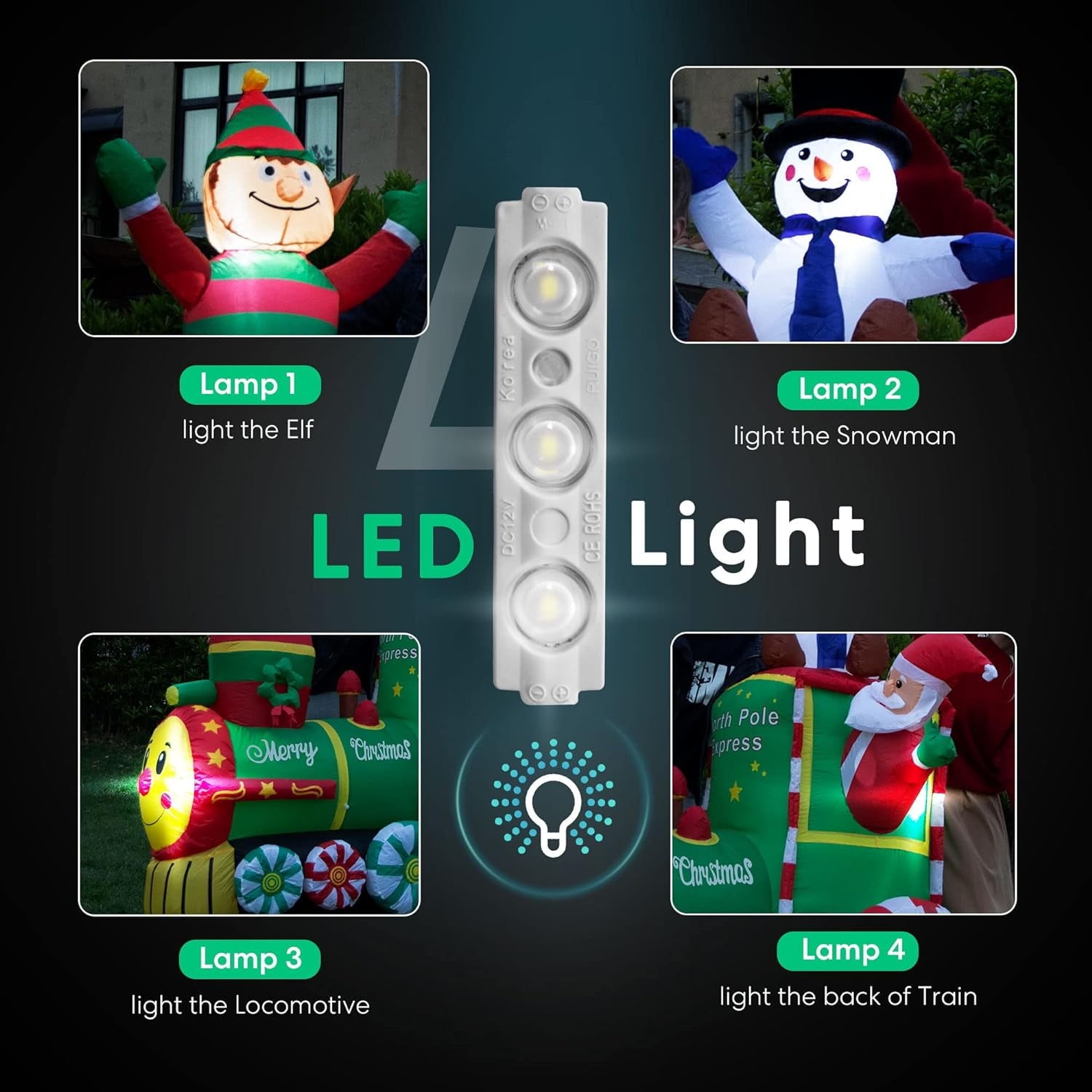 - Internal LED Lights - Christmas blow ups using the built-in LED bulbs that emit white lights, it is perfect for nighttime display that gives warmth to you on this biggest holiday of the year in the cold winter! The extended power cord is suitable for you to put it in different places, such as the garden, lawn, backyard, courtyard, patio, and so on.