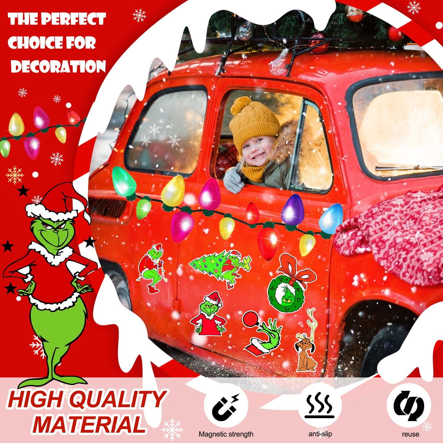 The combination of 8 large bulb magnets, 32pcs small bulb magnets, 6pcs grinch christmas decorations and 20pcs line magnets form a great decoration for car and home decoration.