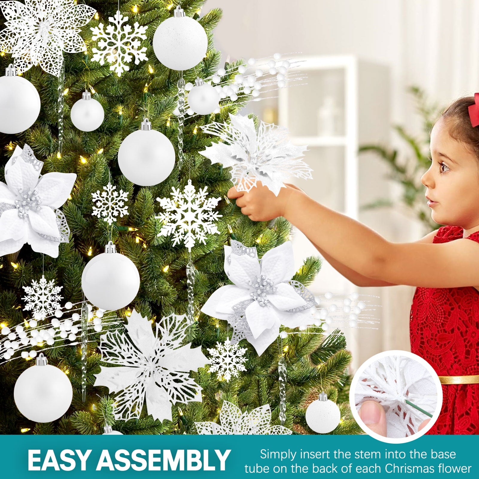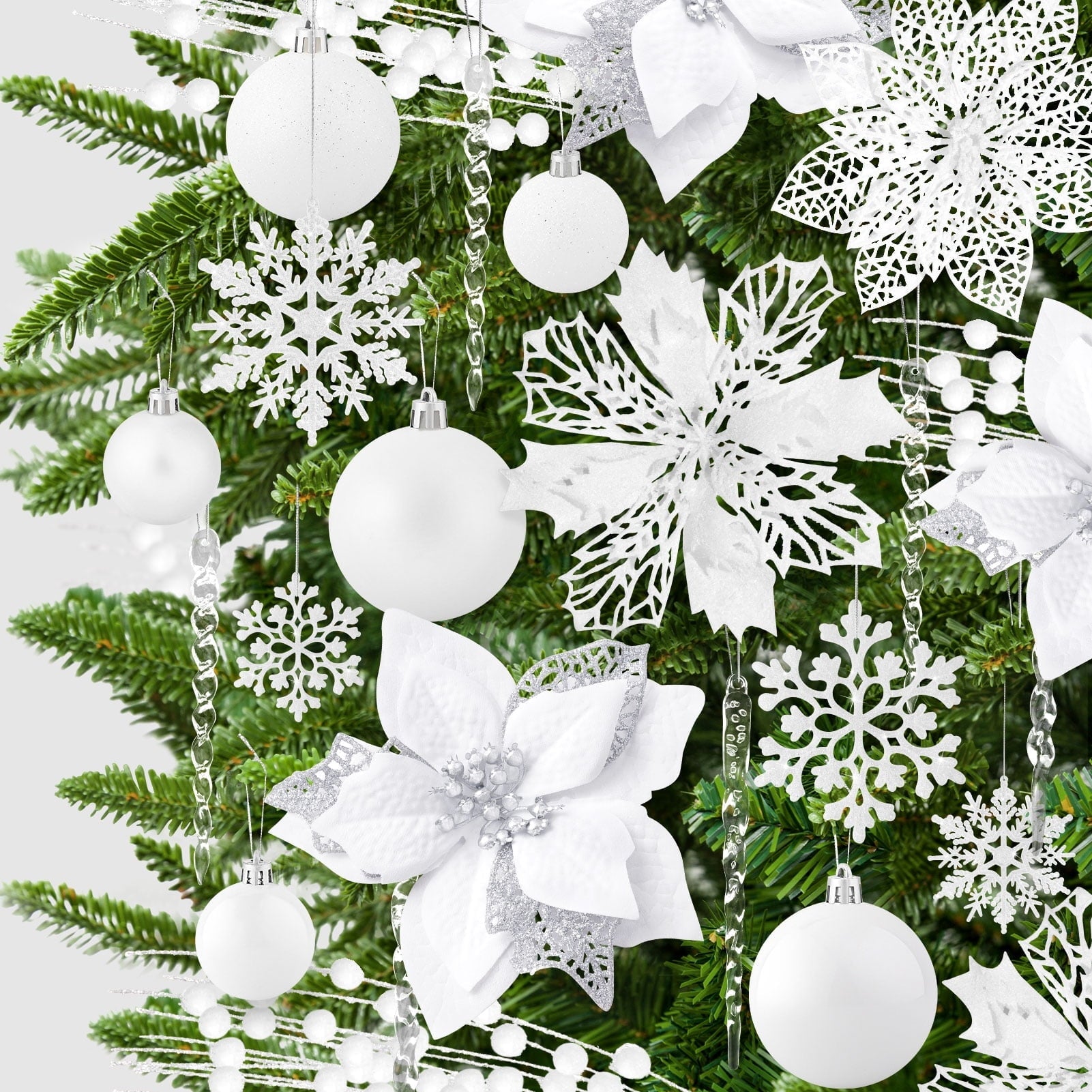 Ayieyill 92Pcs Christmas Tree Decorations Includes Poinsettia Christmas Flowers, Ball Ornaments, Artificial Glitter Berry Stems, Snowflake and Icicle Drop Crystal Ornaments
