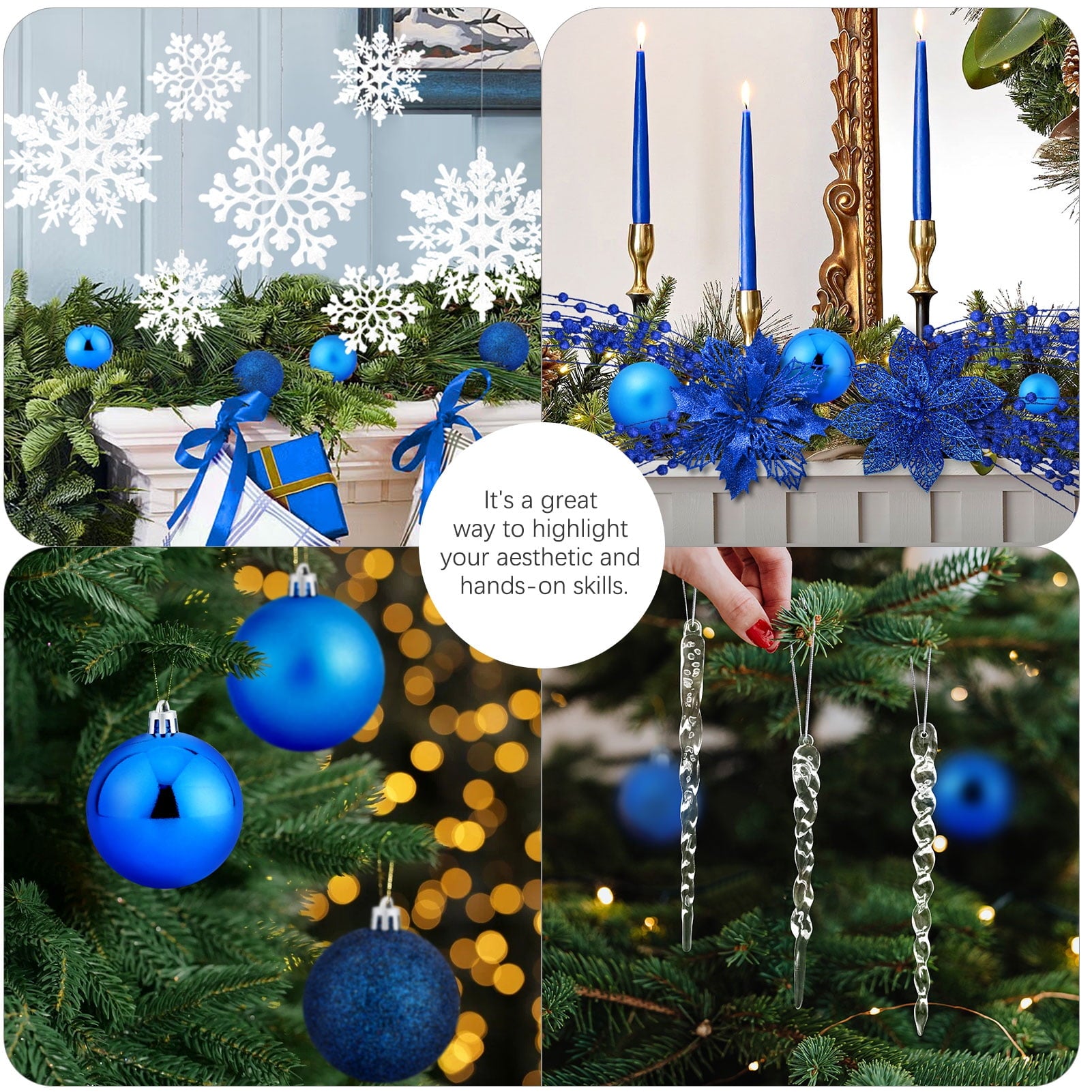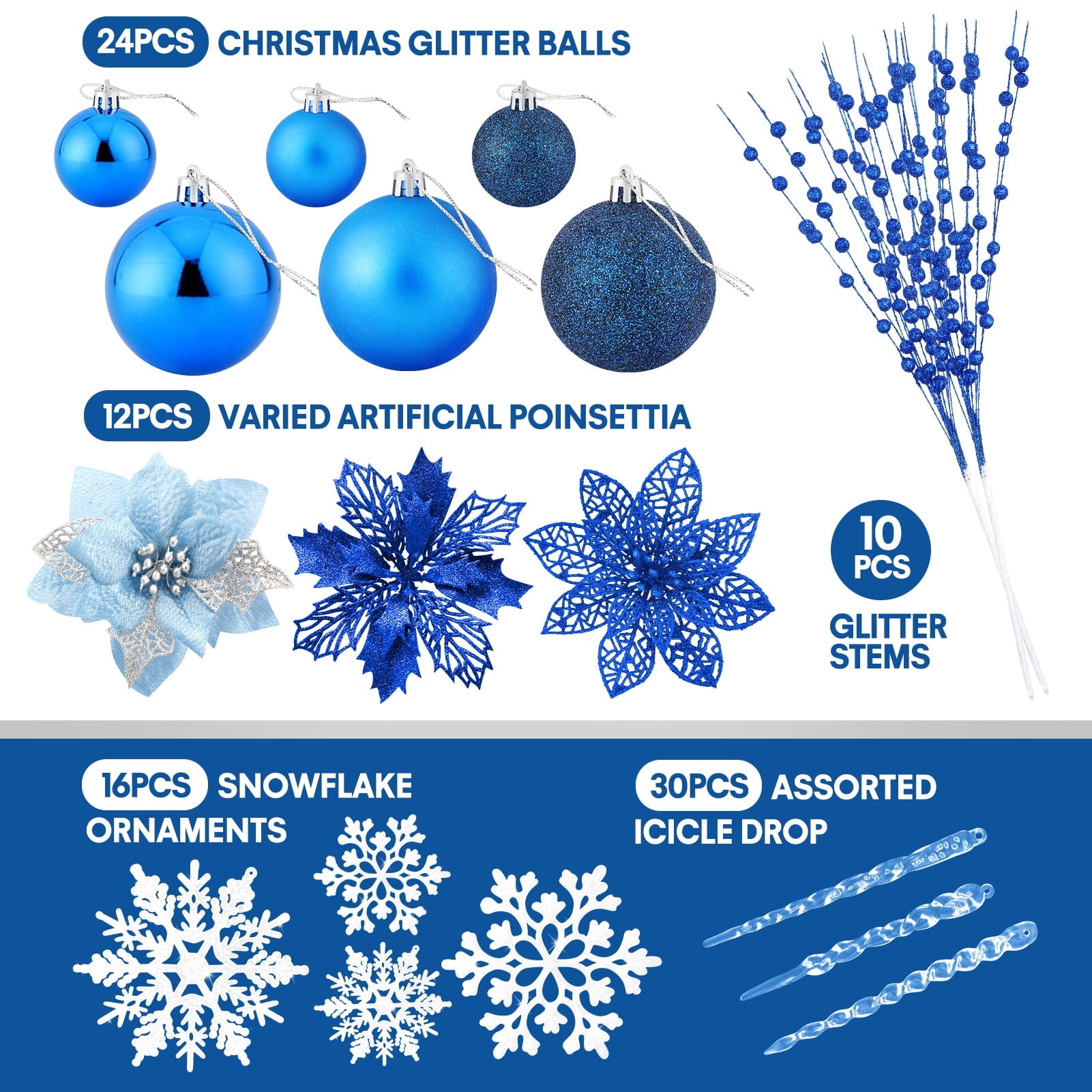 【Christmas Ornaments Set】Total 92pcs blue Christmas tree decoration baubles. Include 24 Balls Ornaments, 16 Snowflakes, 30 Crystal Ornaments, 10 Artificial Berry Stems, 12 Christmas Flowers.