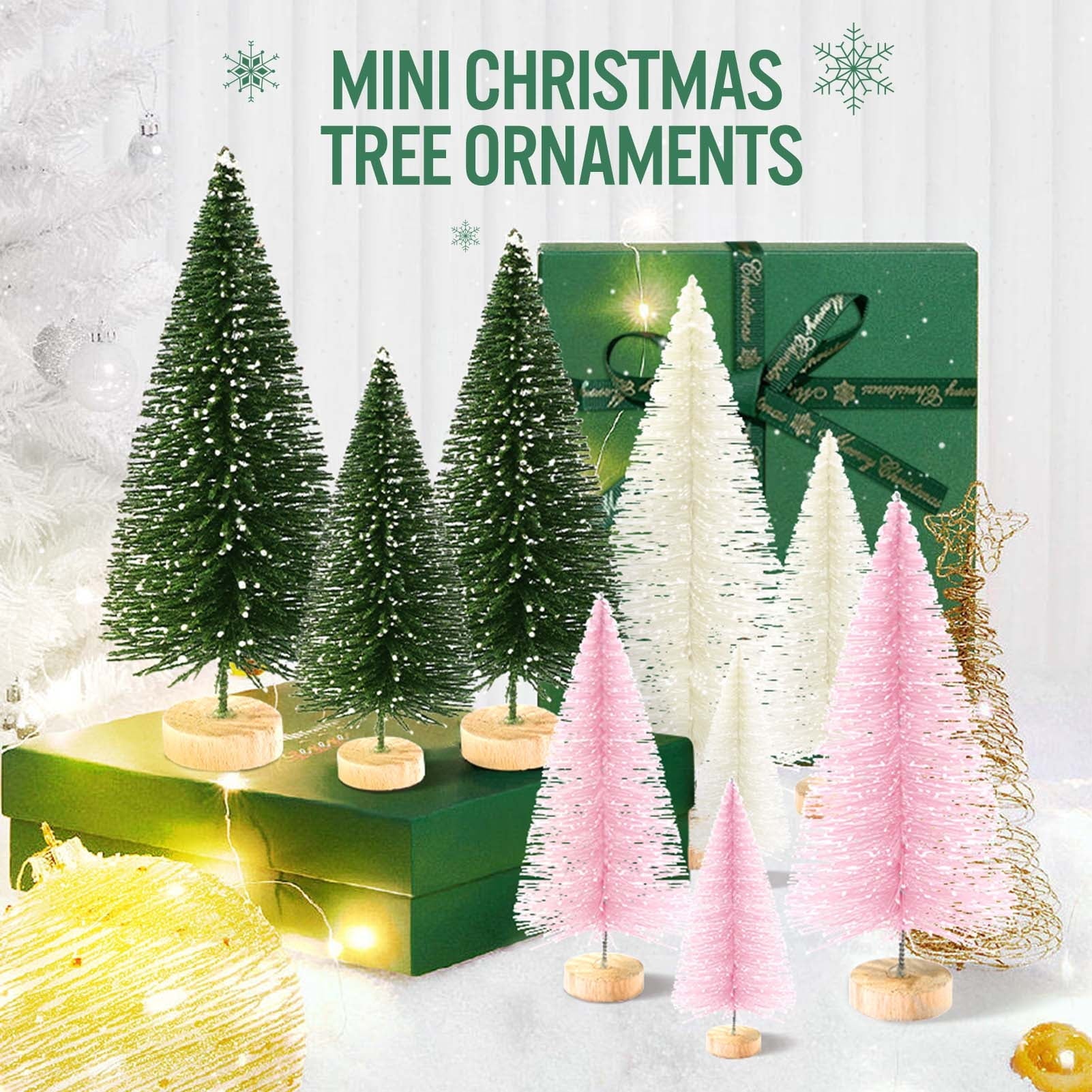Ayieyill 9pcs Small Christmas tree set, including three colors (dark green, white, silver). Snowflakes cover the desktop Christmas tree, which is realistic and lovely. It is very suitable for DIY winter scenes, Christmas ornaments and Christmas party themes, and brings you more Christmas atmosphere.
