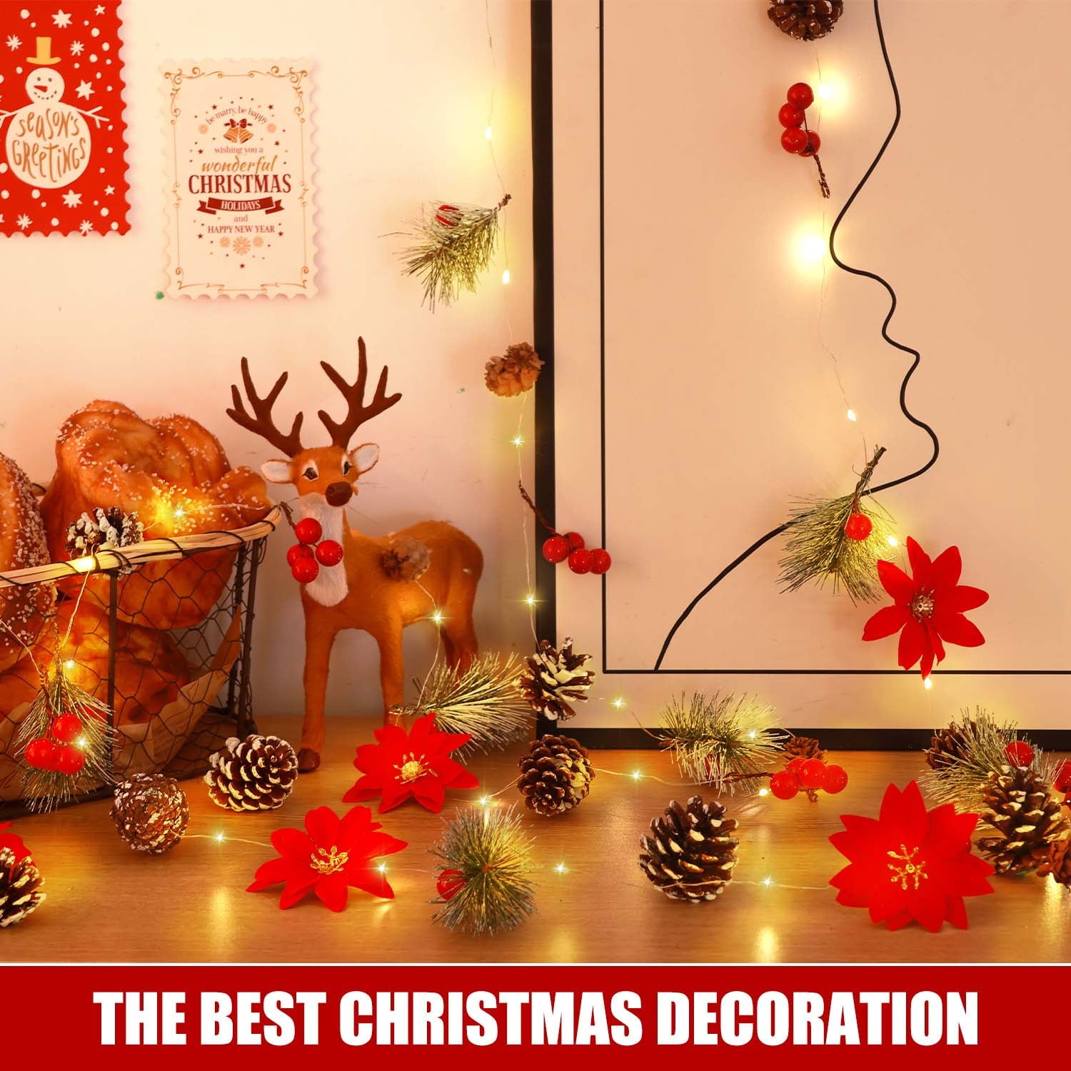 The body of this pine garland decor with lights is copper wired so that you can bend and adjust it to the shape you like and position it as you like wrapped around the Christmas tree, along a mantelpiece or twist it around the banisters of a staircase. Artificial Christmas Garland with light - 98.4 Inch long. Christmas String Lights with pine cones, red berries and red poinsettia Christmas flowers, have three modes of light that can be adjusted, you can choose different light modes to decorate your house according to your preference.