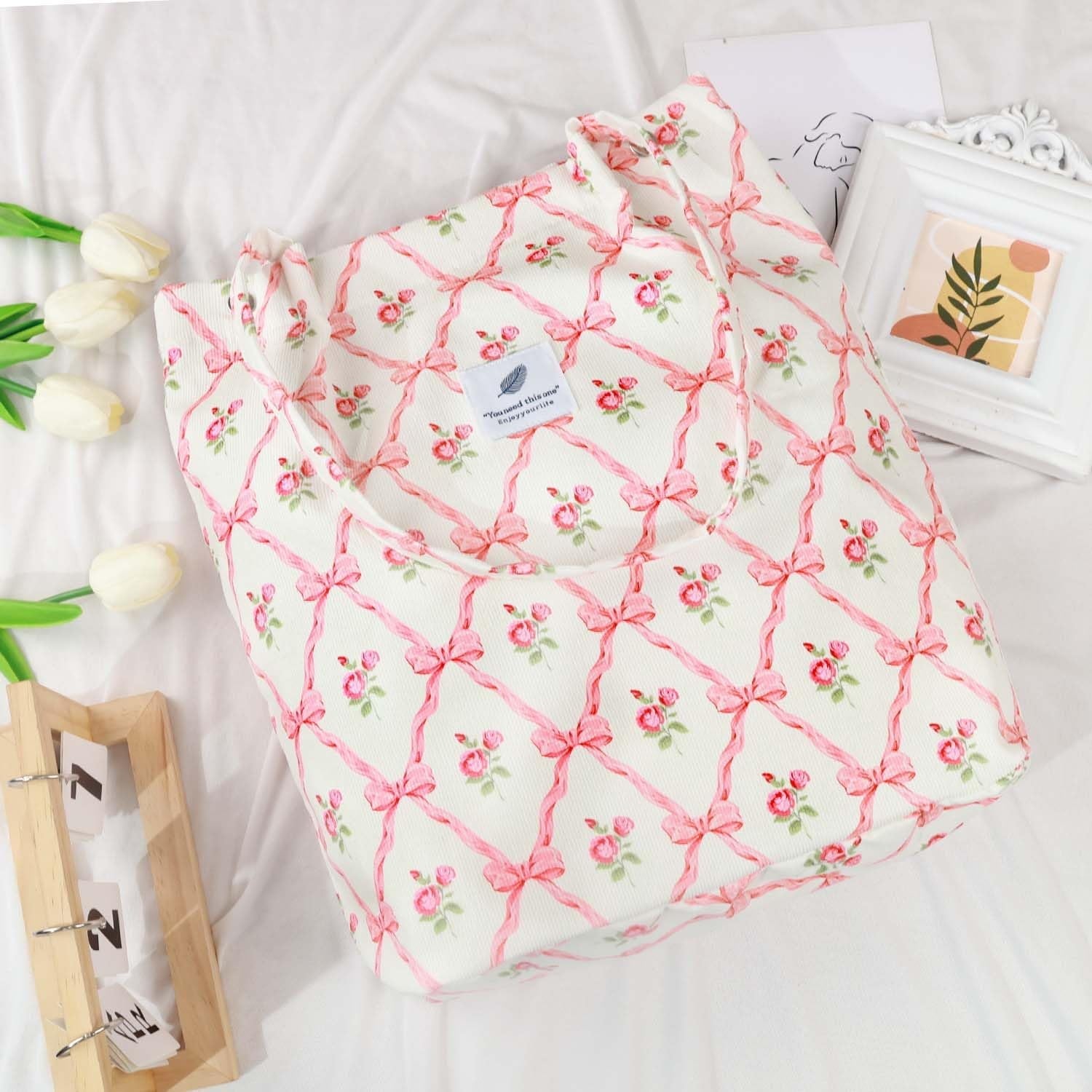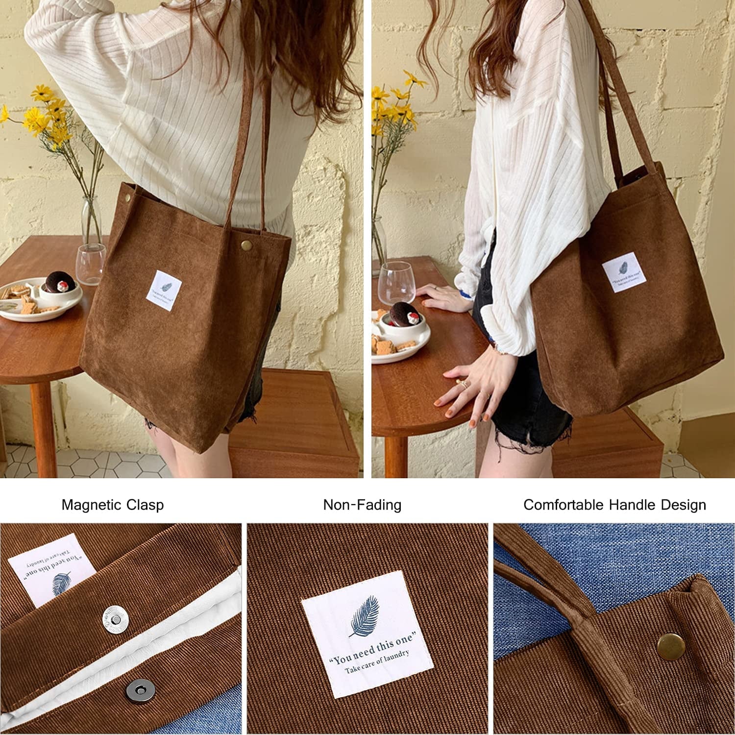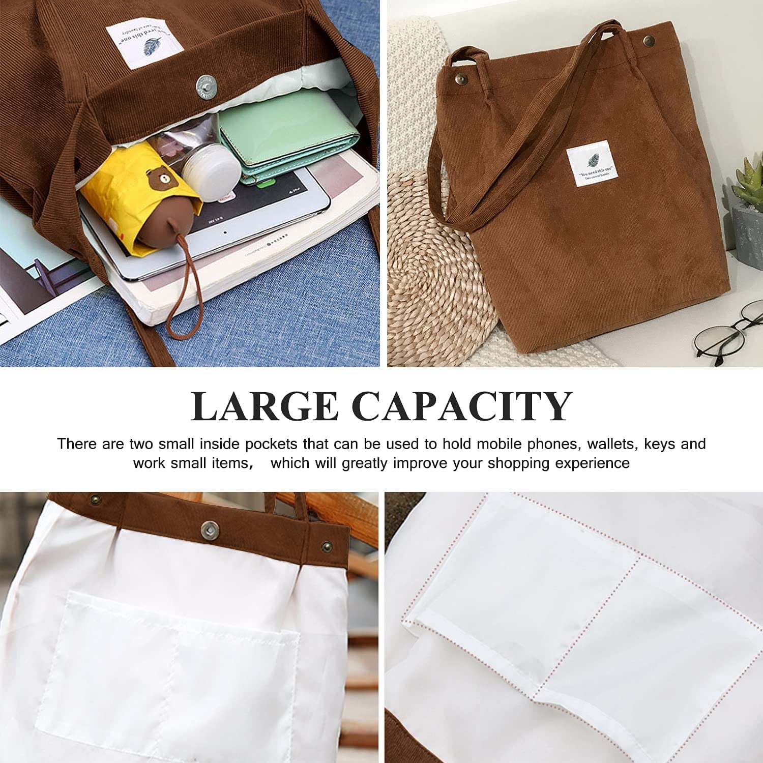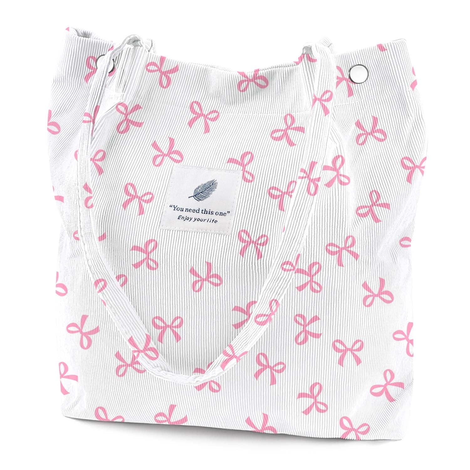 【DIMENSIONS】Cute tote bags size at 13.5" tall x 14.5" wide x 4.3” depth x 11.5" shoulder drop ensure a comfy fit. The space of this corduroy tote bag large is big enough for all of your daily stuffs.Womens tote bags for work also with extra two-pocket design inside create more storage space.
