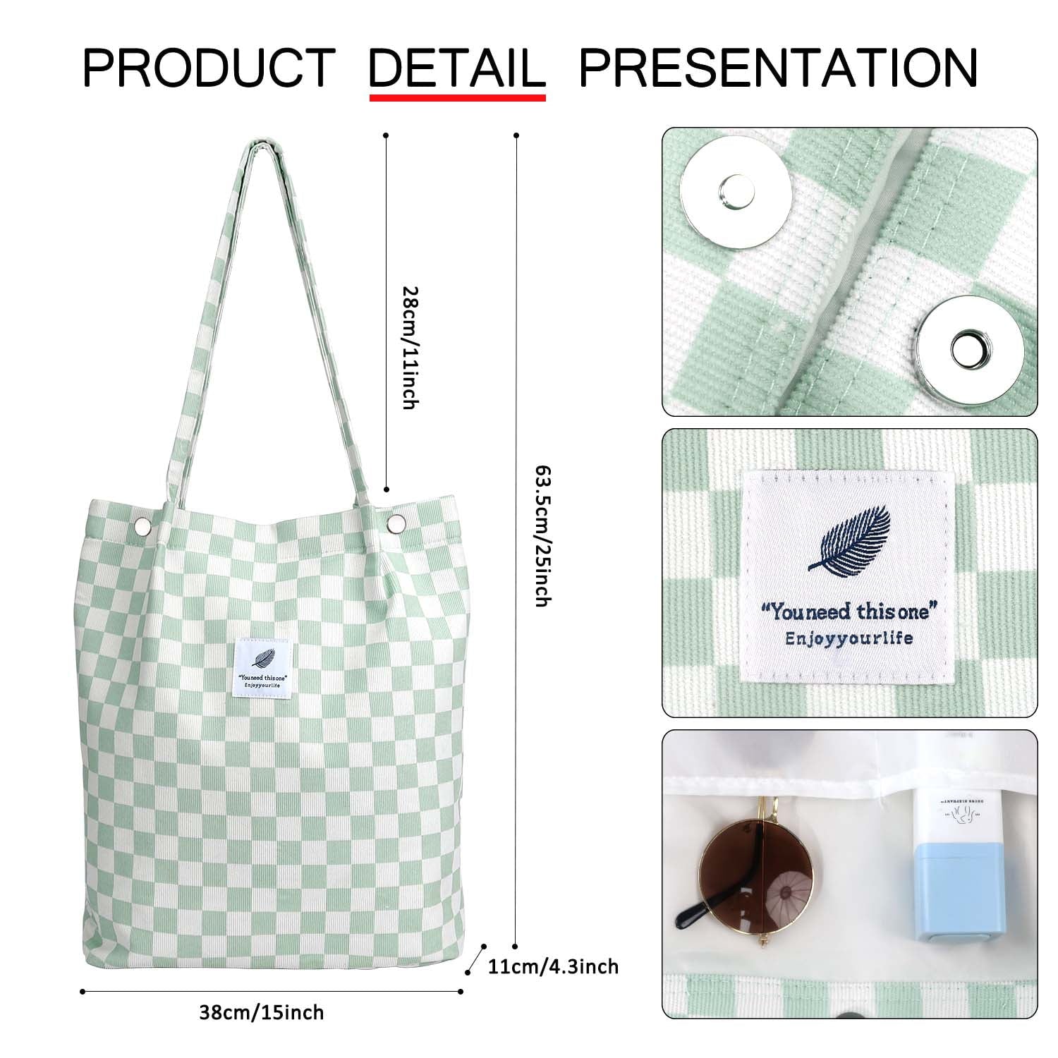 The corduroy tote bag for women shoulder bag, design with 1 main compartment and 2 small pockets. Aesthetic bag available for book, umbrella, laptop, a4 magazine, sports wear. The inside pocket of canvas tote bag aesthetic is great for organizing smaller items, like mobile phone, wallet, keychain, Earphone, makeups, etc.