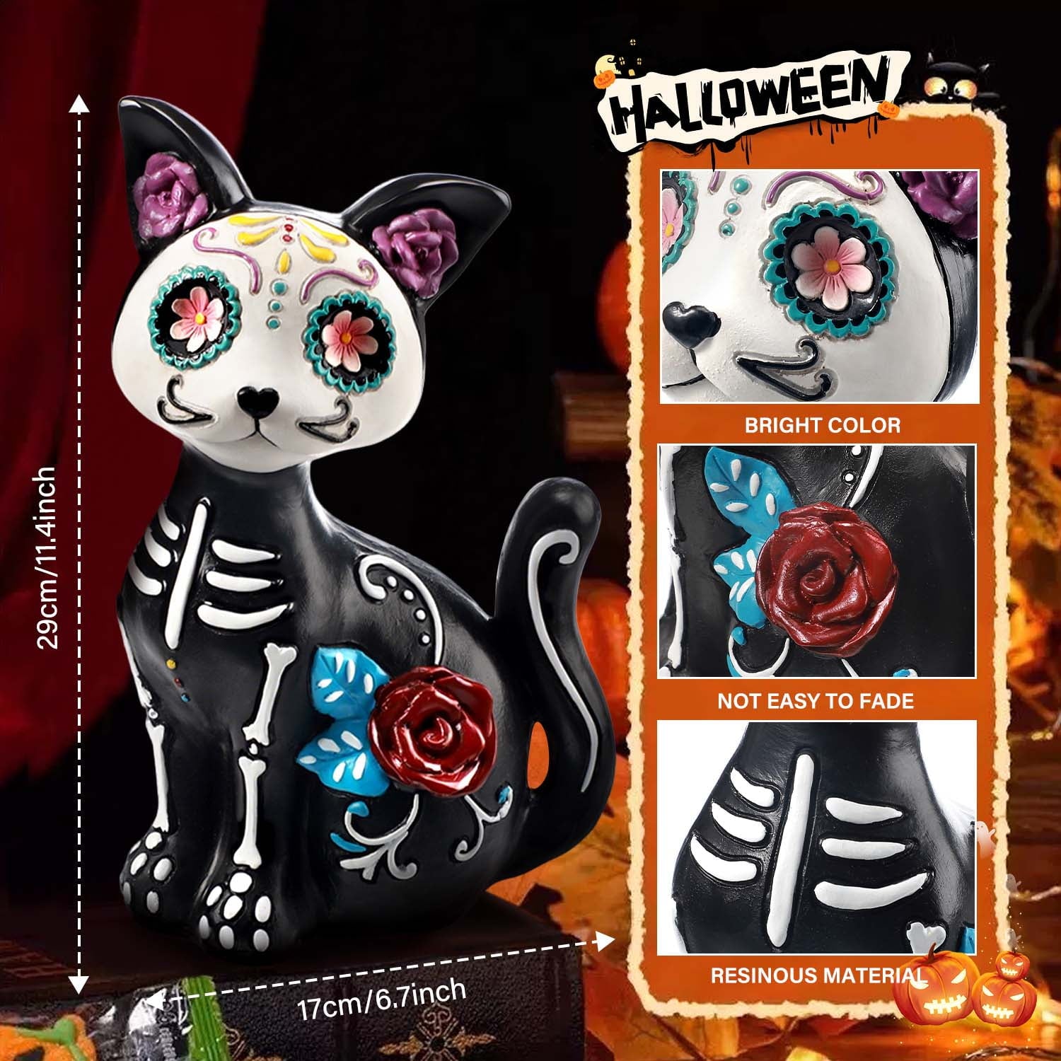 Ayieyill Day of the Dead Cat Figurine, Sugar Skull Halloween Figurines, Dia de los Muertos Decor, Halloween Decorations Indoor, Day of the Dead Decorations