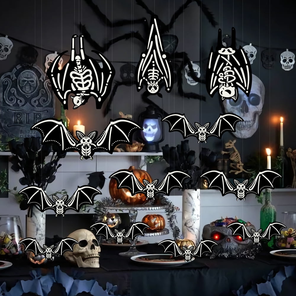 - HALLOWEEN BATS - Includes 12 glowing 3D bats in different sizes and 2 rolls of hanging rope for outdoor use