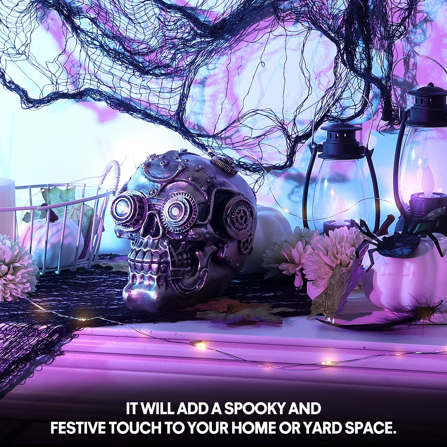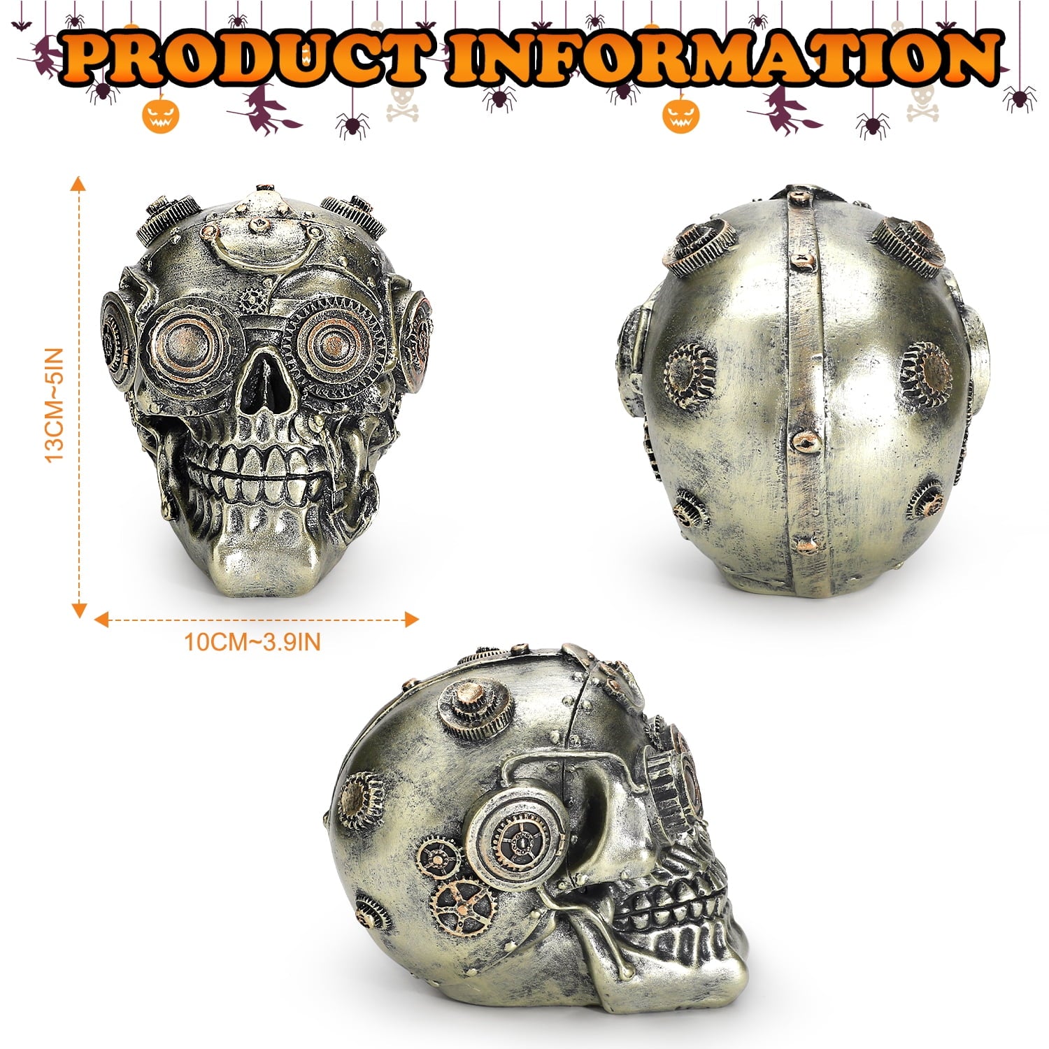 - STEAMPUNK SKULL DESIGN: Detailed steampunk halloween skull with gears and metallic accents, a bold twist for gothic and spooky skull decorations.