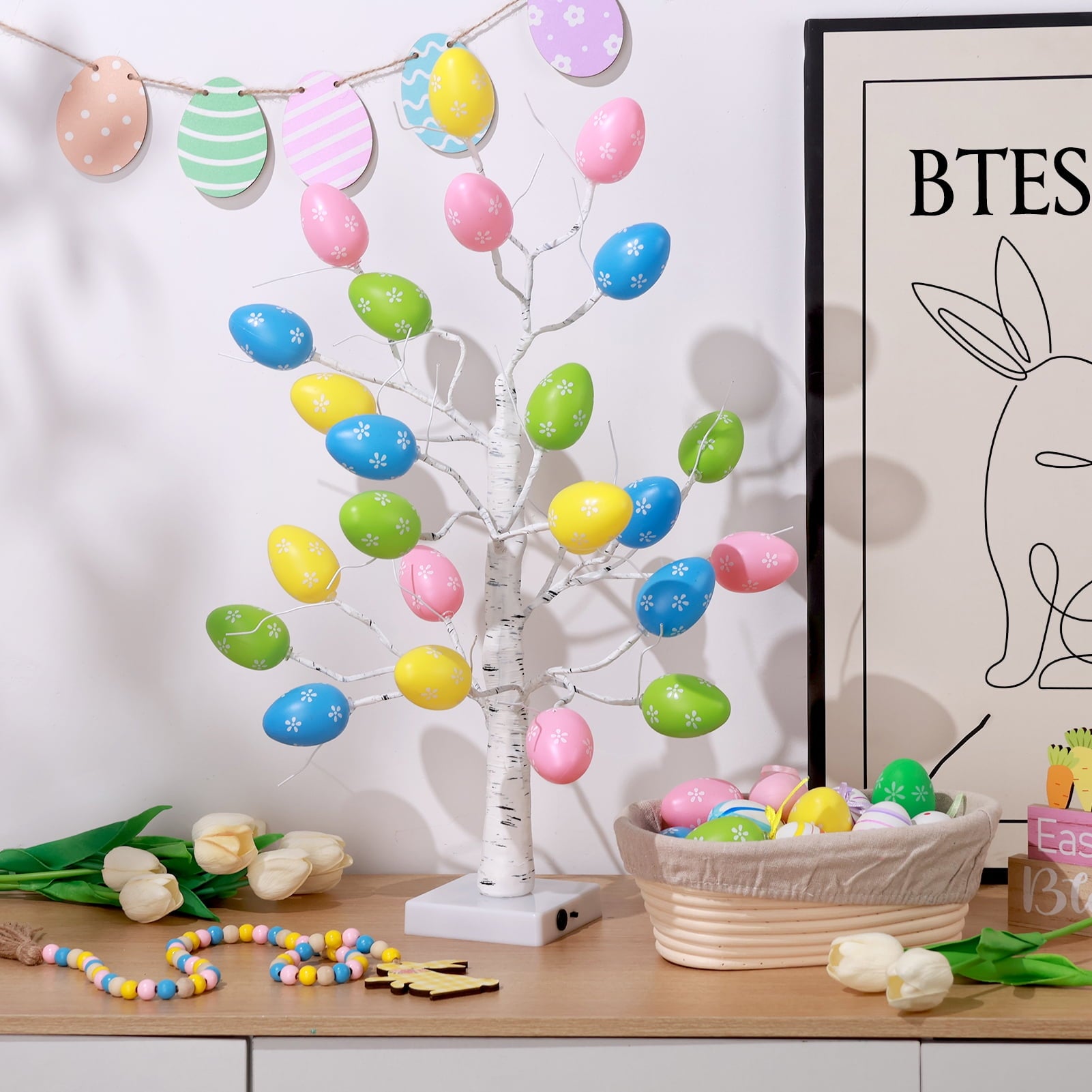 Ayieyill Lighted Easter Egg Tree Tabletop 21 inch Artificial Birch Tree Lights Include 24 Pieces Egg Ornament for Home Spring Easter Decorations