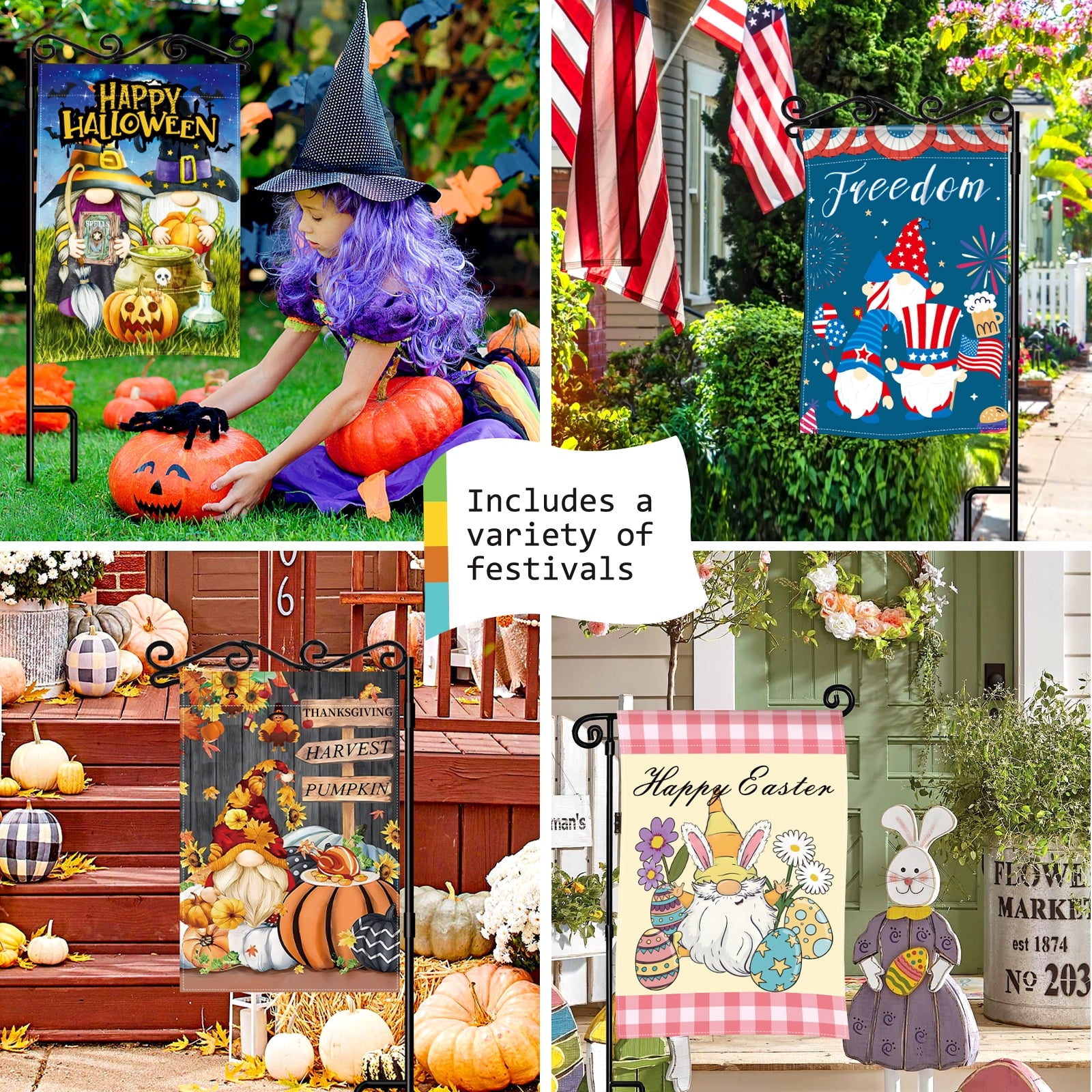 ?Value Package?Comes 12 Pack small garden flag set for every season, important holiday and family occasion: Spring garden Flag, Summer Garden Flag, Fall garden flag, Winter garden Flag, Valentine's Garden Flag, St. Patricks Garden Flag, Easter Garden Flag, Mother's Day Garden Flag, 4th of July Garden Flag, Halloween Garden Flag, Thanksgiving Garden Flag, Christmas Garden Flag. Our seasonal flags can meet your different needs to decorate your house and garden all the year!