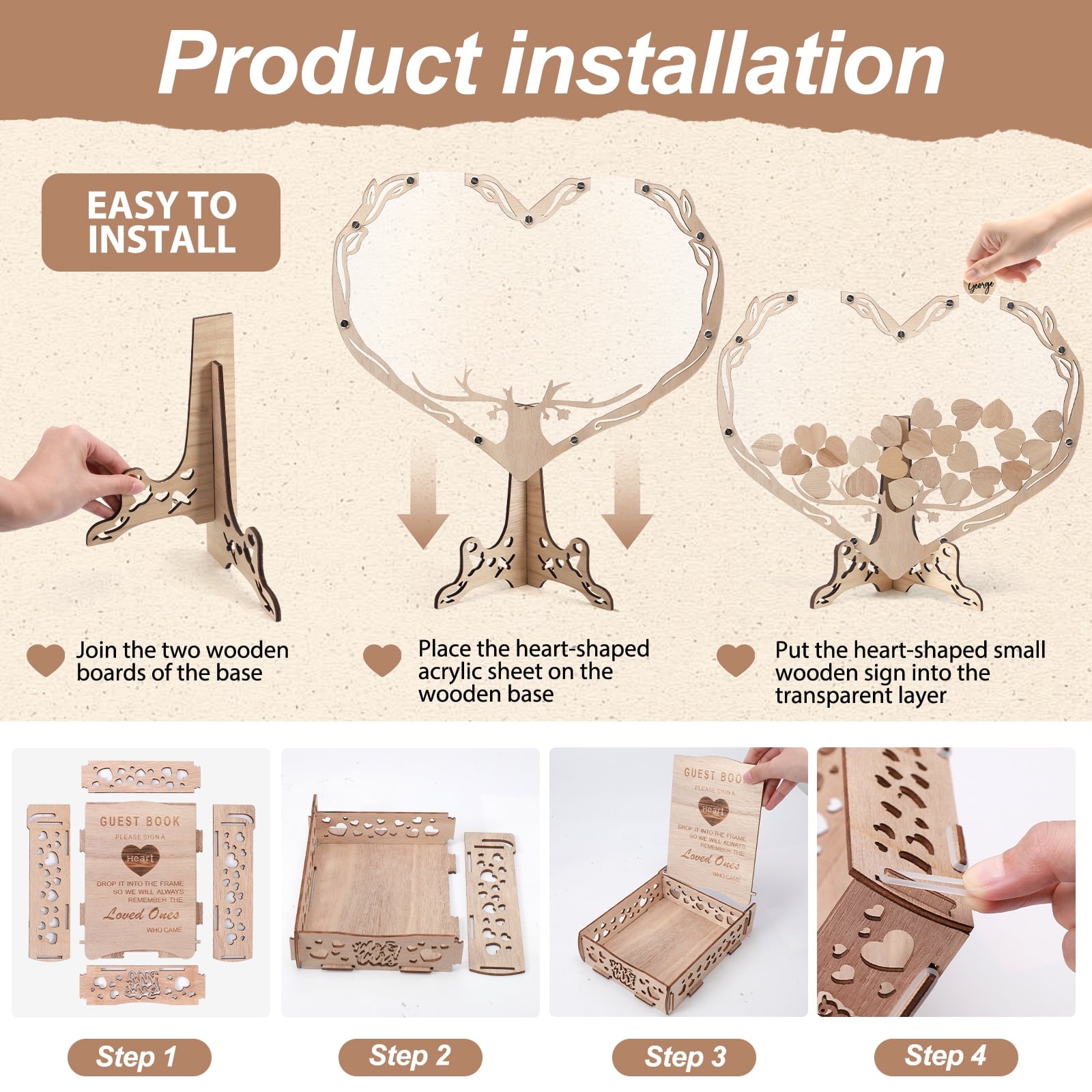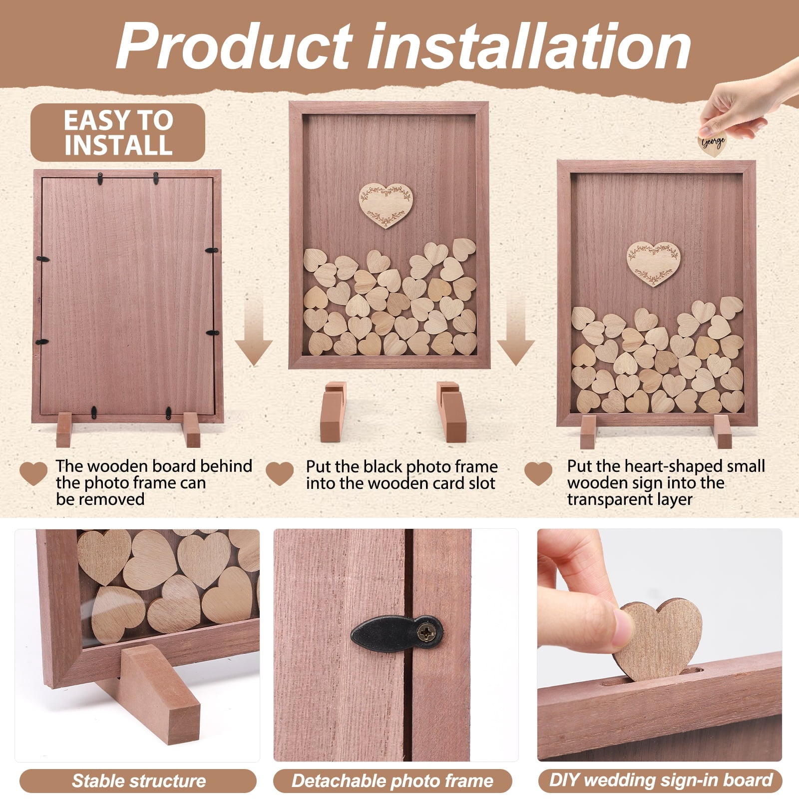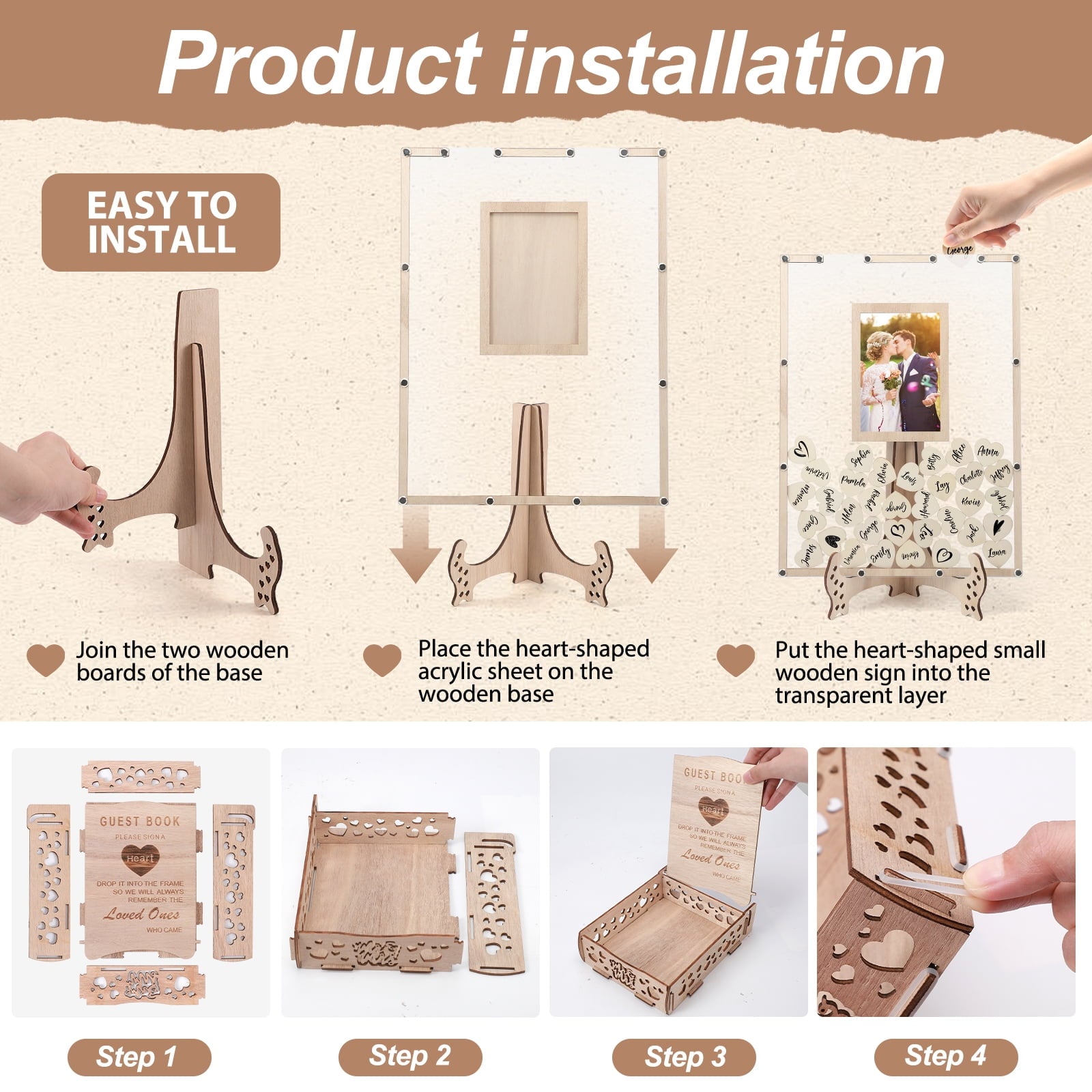 - Material: This wedding guest book is made of pine wood, not easy to break and is stable, which can be kept for a long time, suitable for matching various styles, beautiful and stylish. The wood heart is laser cut with a flat surface and smooth edges, beautiful craftsmanship. Highly transparent acrylic glass clearly display the wooden heart and wishes inside
