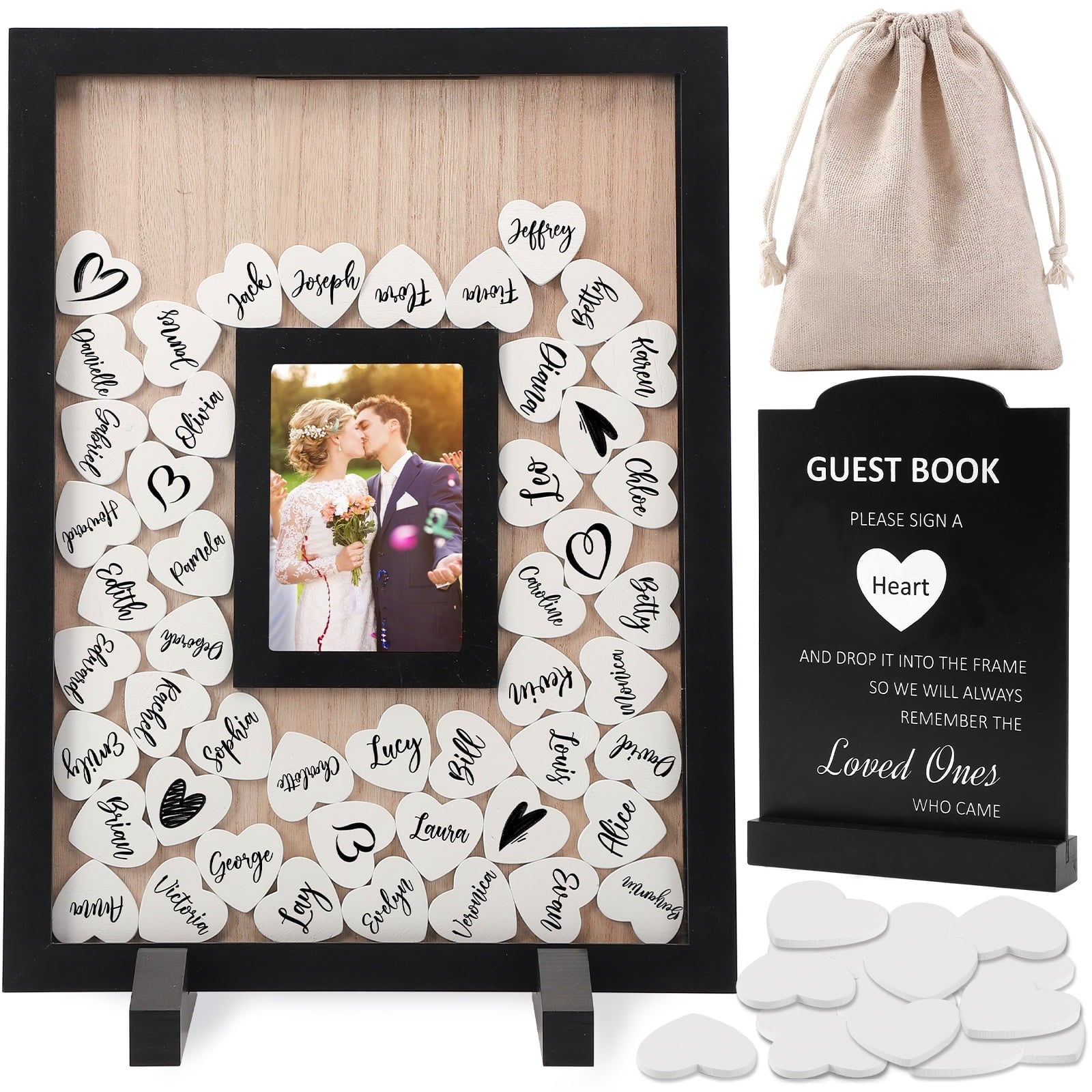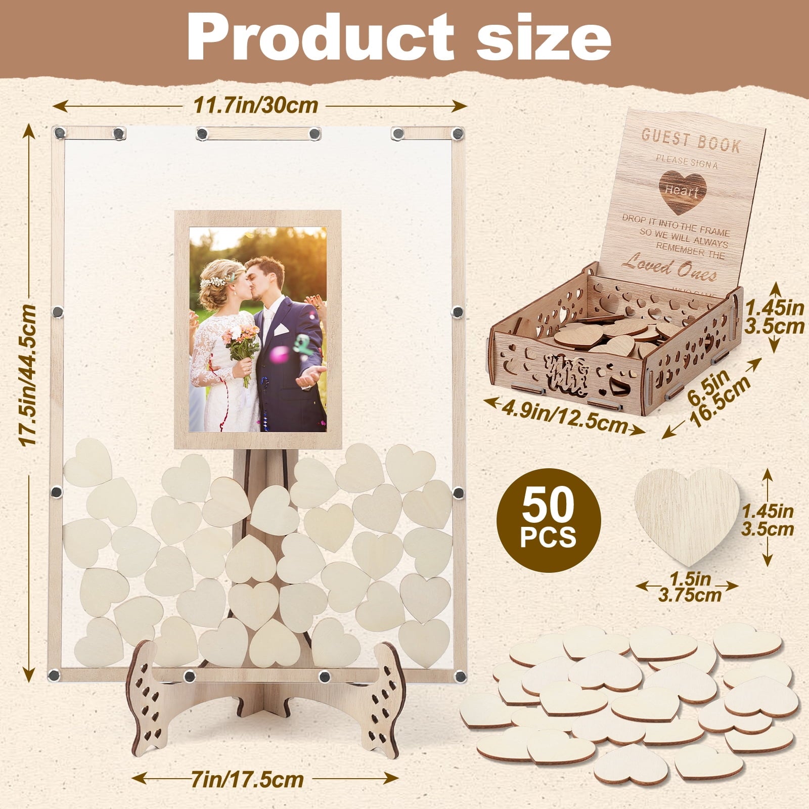 - Wooden Guest Book Set: This alternative square guest book set includes a 12x16.5in reception guest book frame for display. A base stand for easy vertical placement of the wooden frame on the wedding reception table. 50 pieces wooden hearts for guests to sign. A canvas bag for heart storage. A 6x9in welcome autograph sign.
